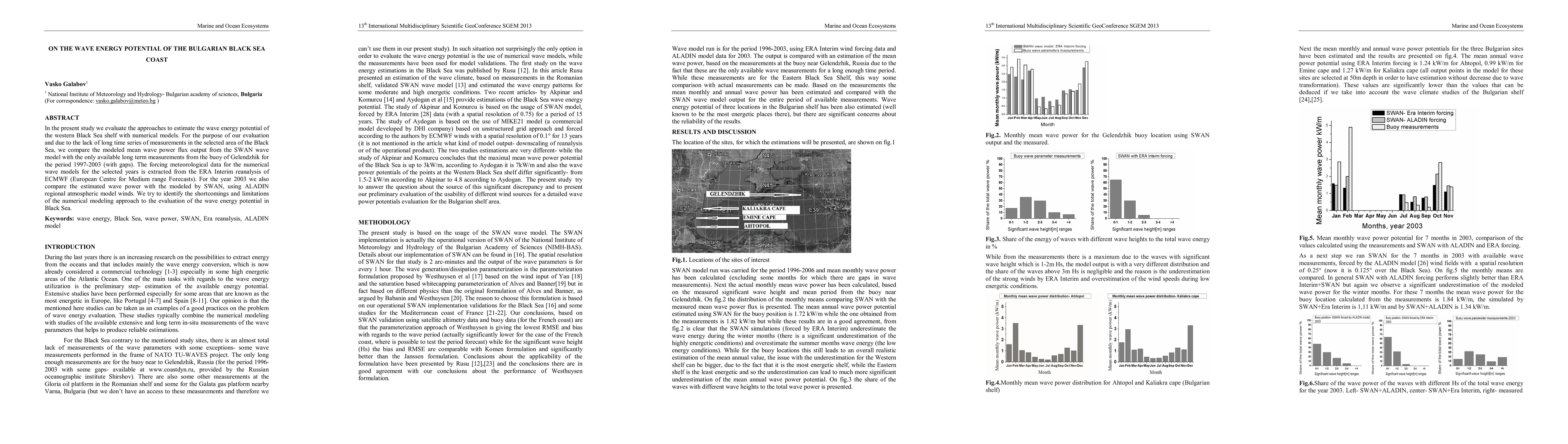 This study evaluates wave energy potential in the Western Black Sea shelf using the SWAN wave model and ERA Interim reanalysis data due to limited long-term measurements. It identifies strengths and weaknesses of numerical modeling for wave energy assessment in the region.