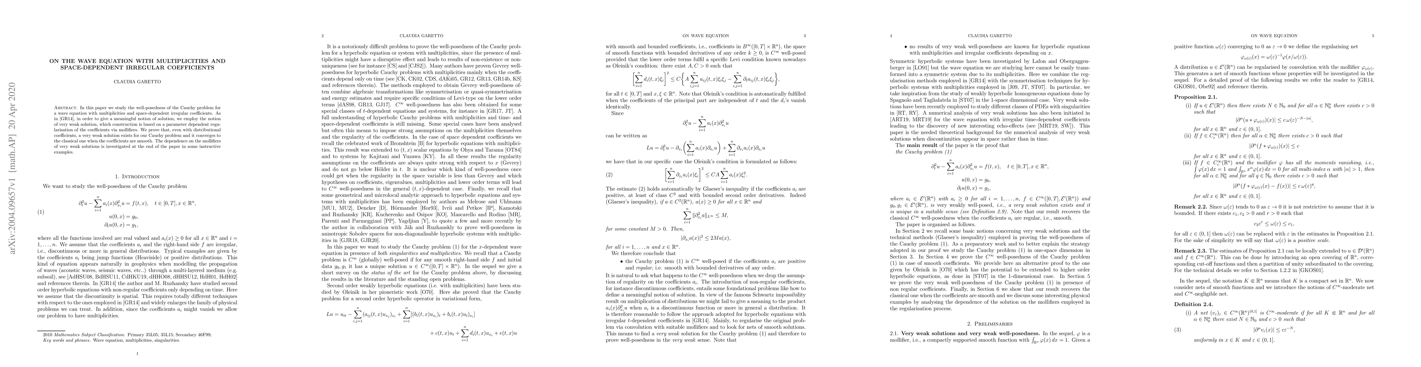 This paper investigates the well-posedness of the Cauchy problem for a wave equation with multiplicities and irregular, space-dependent coefficients. It employs a very weak solution concept based on mollifiers to construct solutions, proving existence and convergence to classical solutions when coefficients are smooth.