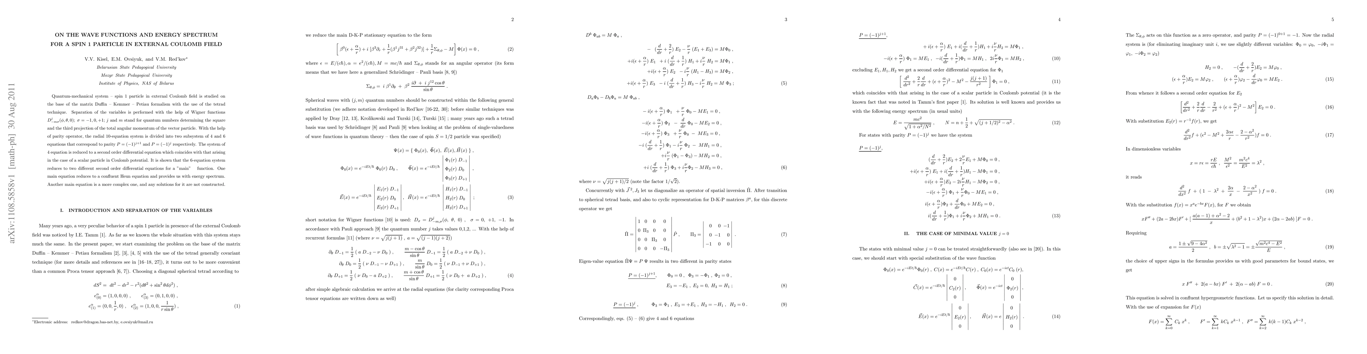 Quantum-mechanical system -- spin 1 particle in external Coulomb field is studied on the base of the matrix Duffin-Kemmer-Petiau formalism with the use of the tetrad technique. Separation of the variables is performed with the help of Wigner functions. With the help of parity operator, the radial 10-equation system is divided into two subsystem of 4 and 6 equations that correspond to parity P=(-1)^{j+1} and P= (-1)^{j} respectively. The system of 4 equation is reduced to a second order differential equation which coincides with that arising in the case of a scalar particle in Coulomb potential. It is shown that the 6-equation system reduces to two different second order differential equations for a "main" function. One main equation reduces to a confluent Heun equation and provides us with energy spectrum. Another main equation is a more complex one, and any solutions for it are not constructed.