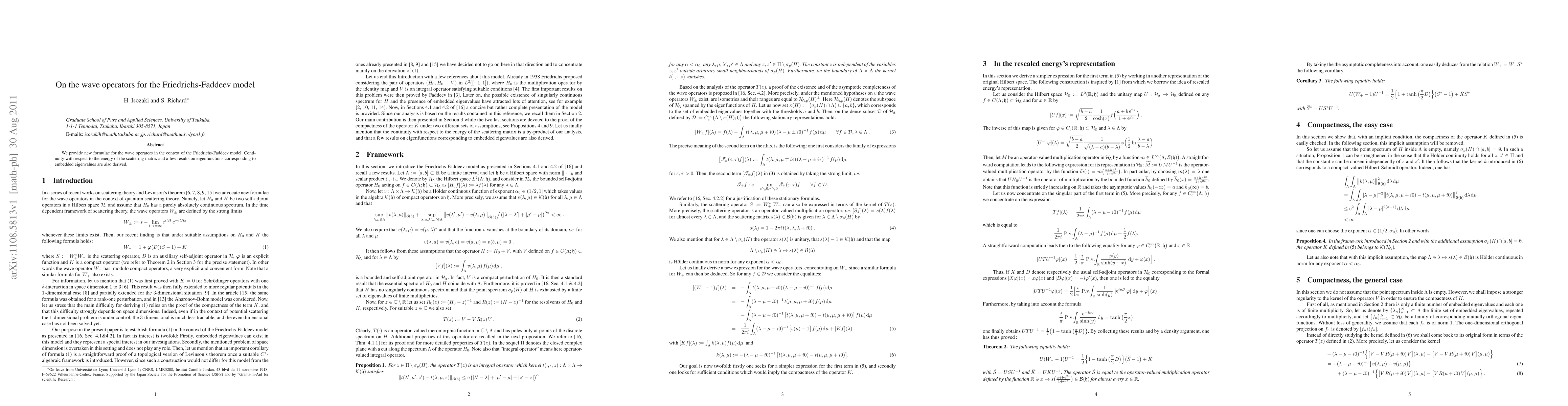 We provide new formulae for the wave operators in the context of the Friedrichs-Faddeev model. Continuity with respect to the energy of the scattering matrix and a few results on eigenfunctions corresponding to embedded eigenvalues are also derived.