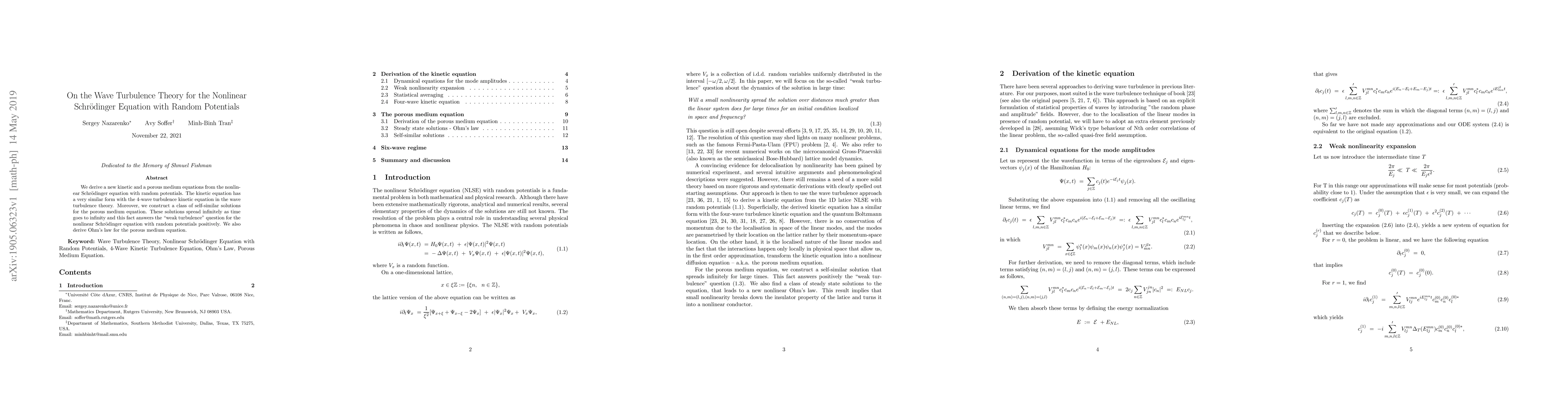 This paper derives new kinetic and porous medium equations from the nonlinear Schrödinger equation with random potentials, establishing a similarity to the 4-wave turbulence kinetic equation. It also constructs self-similar solutions for the porous medium equation, confirming the 'weak turbulence' phenomenon and deriving Ohm's law for the latter.