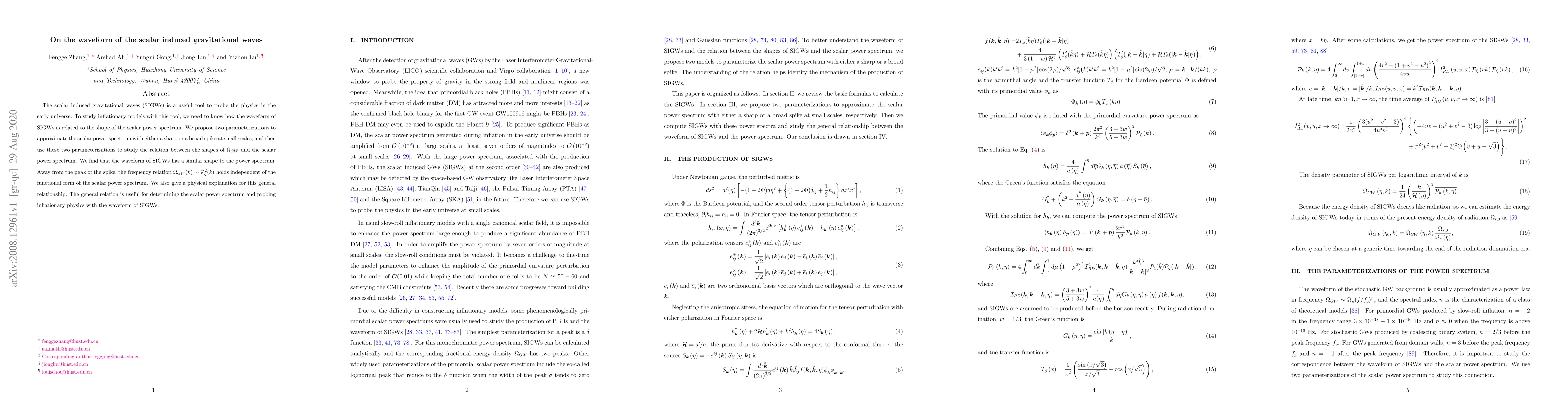 This paper investigates the waveform of scalar induced gravitational waves (SIGWs) to probe early universe physics, proposing two parameterizations for the scalar power spectrum. It finds a general relation $\Omega_{GW}(k)\sim \mathcal{P}_\zeta^2(k)$ between the SIGW waveform and the scalar power spectrum, useful for determining the latter and studying inflationary models.