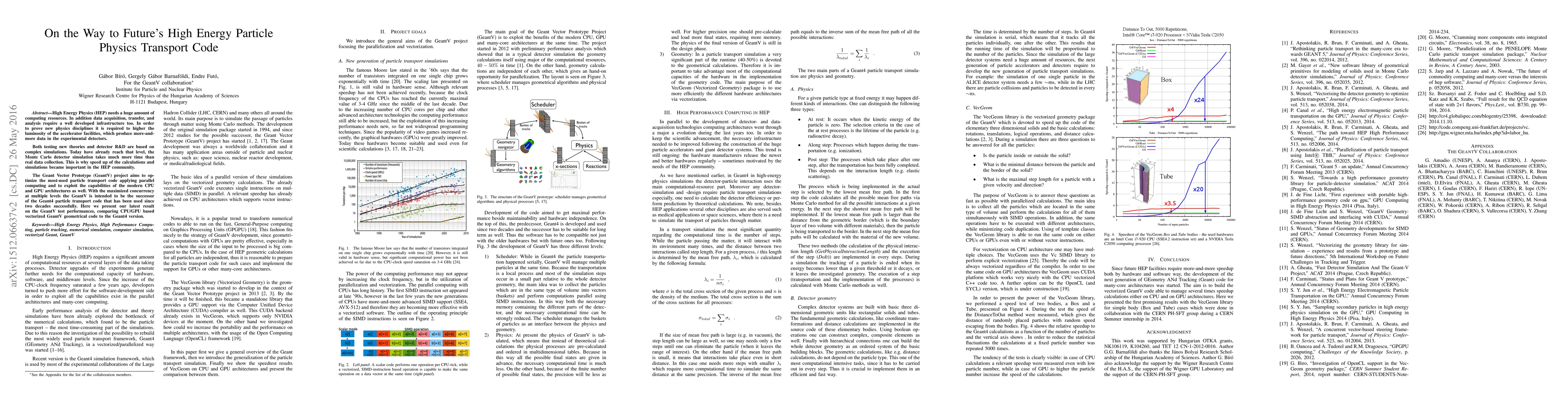 High Energy Physics (HEP) needs a huge amount of computing resources. In addition data acquisition, transfer, and analysis require a well developed infrastructure too. In order to prove new physics disciplines it is required to higher the luminosity of the accelerator facilities, which produce more-and-more data in the experimental detectors. Both testing new theories and detector R&D are based on complex simulations. Today have already reach that level, the Monte Carlo detector simulation takes much more time than real data collection. This is why speed up of the calculations and simulations became important in the HEP community. The Geant Vector Prototype (GeantV) project aims to optimize the most-used particle transport code applying parallel computing and to exploit the capabilities of the modern CPU and GPU architectures as well. With the maximized concurrency at multiple levels the GeantV is intended to be the successor of the Geant4 particle transport code that has been used since two decades successfully. Here we present our latest result on the GeantV tests performances, comparing CPU/GPU based vectorized GeantV geometrical code to the Geant4 version.