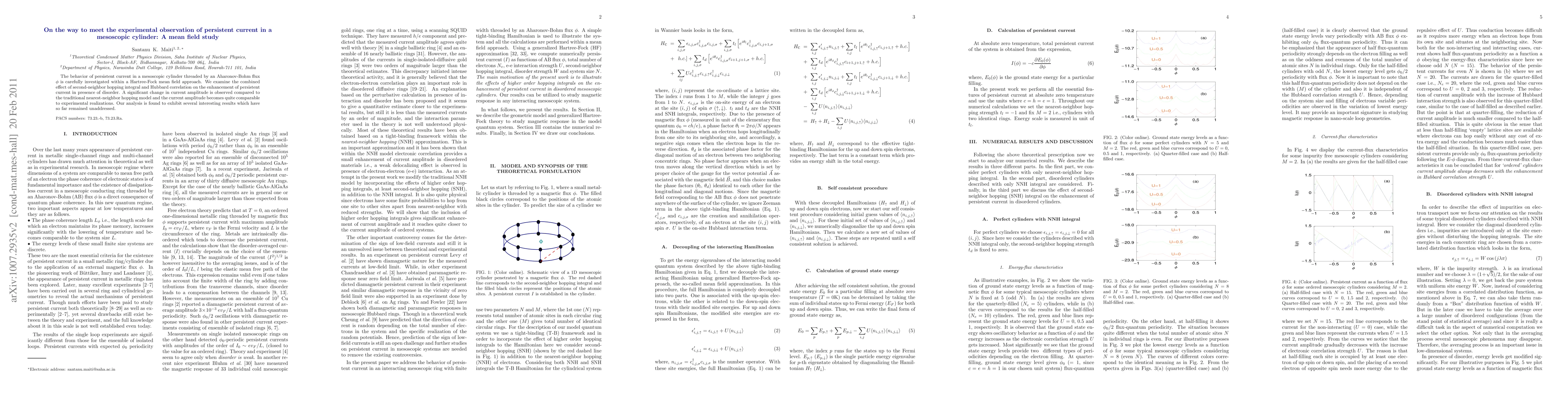 This study investigates persistent current in a mesoscopic cylinder using a Hartree-Fock mean field approach, focusing on the effects of second-neighbor hopping and Hubbard correlation in the presence of disorder. The results show a significant enhancement in current amplitude, bringing it closer to experimental observations.