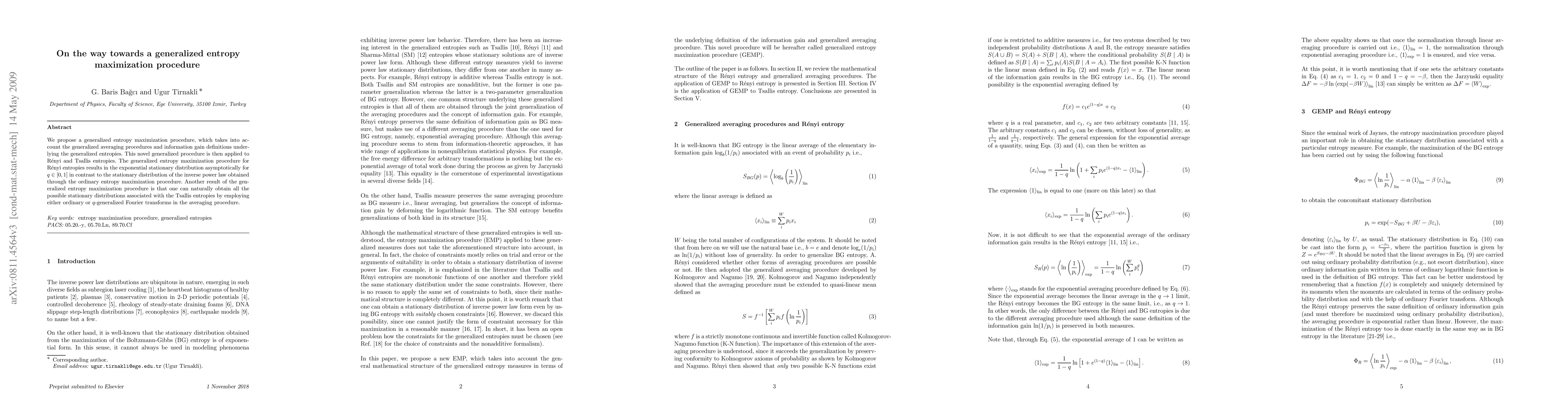 This paper proposes a novel generalized entropy maximization procedure that accommodates generalized averaging and information gain definitions, applied to Renyi and Tsallis entropies. It results in exponential stationary distributions for Renyi entropies and provides a method to obtain Tsallis entropy stationary distributions via Fourier transforms.