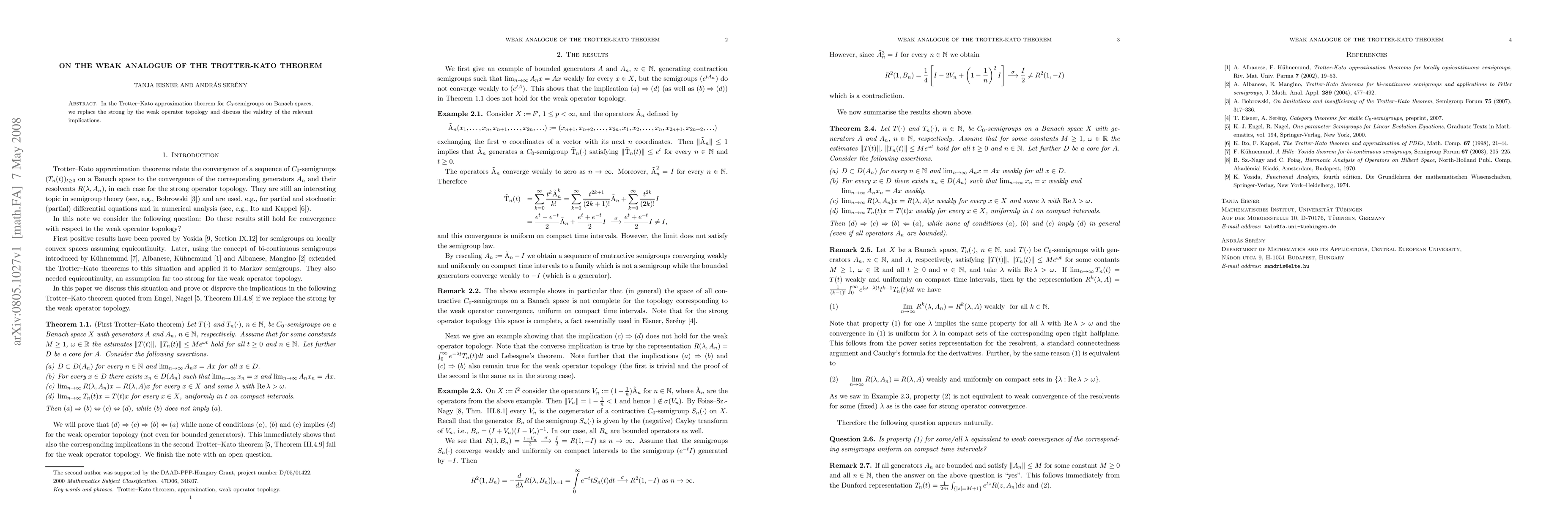 Summary: This paper investigates the weak analogue of the Trotter-Kato theorem, examining the implications when the strong operator topology is replaced by the weak operator topology in the context of C_0-semigroups on Banach spaces. The validity of the relevant approximations is explored.