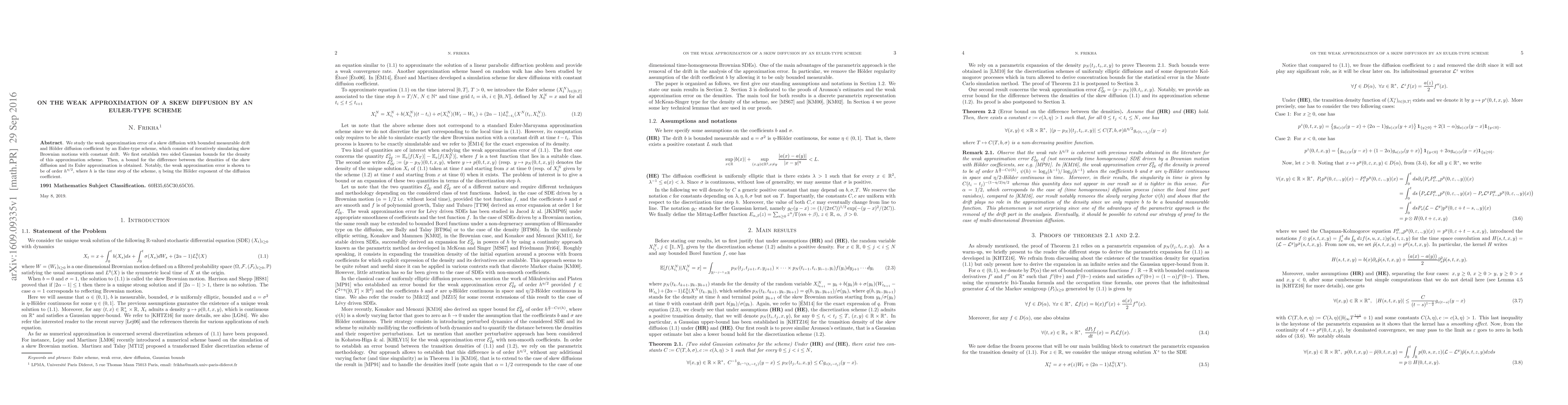 We study the weak approximation error of a skew diffusion with bounded measurable drift and H\"older diffusion coefficient by an Euler-type scheme, which consists of iteratively simulating skew Brownian motions with constant drift. We first establish two sided Gaussian bounds for the density of this approximation scheme. Then, a bound for the difference between the densities of the skew diffusion and its Euler approximation is obtained. Notably, the weak approximation error is shown to be of order $h^{\eta/2}$, where $h$ is the time step of the scheme, $\eta$ being the H\"older exponent of the diffusion coefficient.