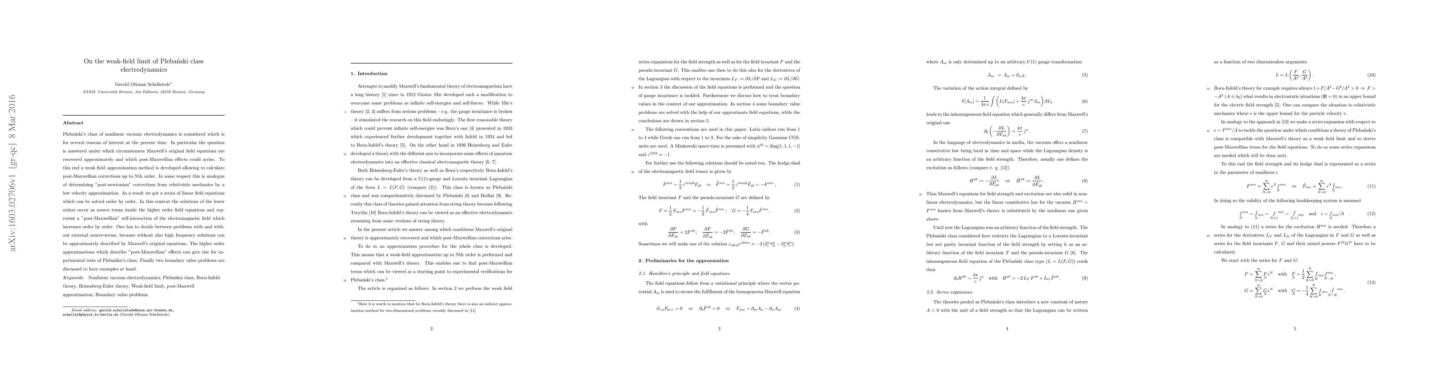 Pleba\'nski's class of nonlinear vacuum electrodynamics is considered which is for several reasons of interest at the present time. In particular the question is answered under which circumstances Maxwell's original field equations are recovered approximately and which post-Maxwellian effects could arrise. To this end a weak field approximation method is developed allowing to calculate post-Maxwellian corrections up to Nth order. In some respect this is analogue of determining "post-newtonian" corrections from relativistic mechanics by a low velocity approximation. As a result we got a series of linear field equations which can be solved order by order. In this context the solutions of the lower orders occur as source terms inside the higher order field equations and represent a "post-Maxwellian" self-interaction of the electromagnetic field which increases order by order. One has to decide between problems with and without external source-terms, because without also high frequency solutions can be approximately described by Maxwell's original equations. The higher order approximations which describe "post-Maxwellian" effects can give rise for experimental tests of Pleba\'nksi's class. Finally two boundary value problems are discussed to have examples at hand.