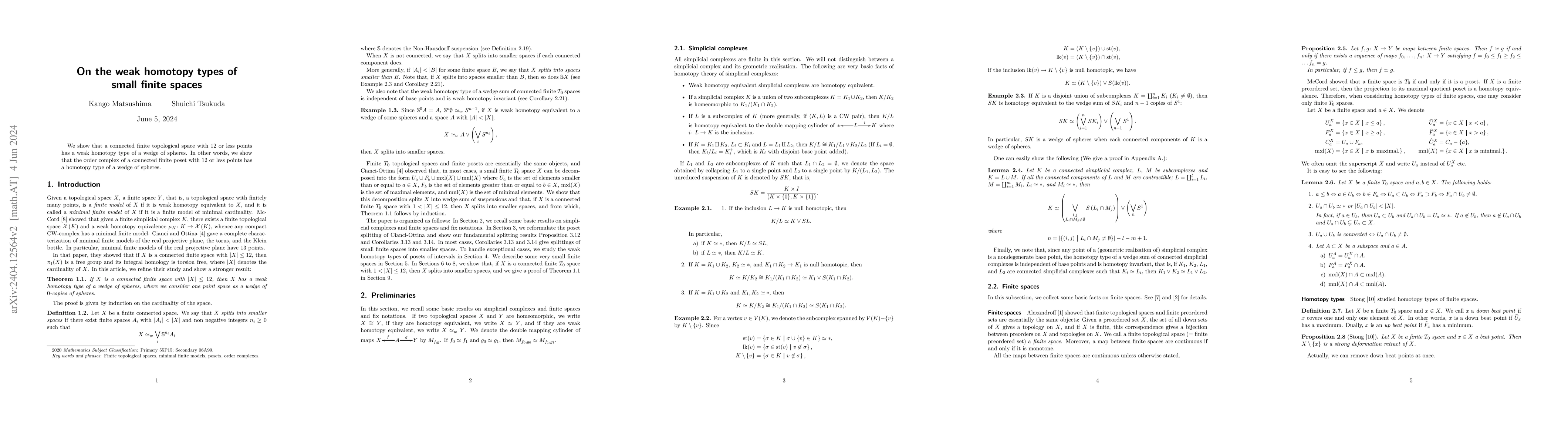 Summary: This paper demonstrates that connected finite topological spaces with 12 or fewer points exhibit a weak homotopy type equivalent to a wedge of spheres, analogously for the order complex of connected finite posets with similar point counts.