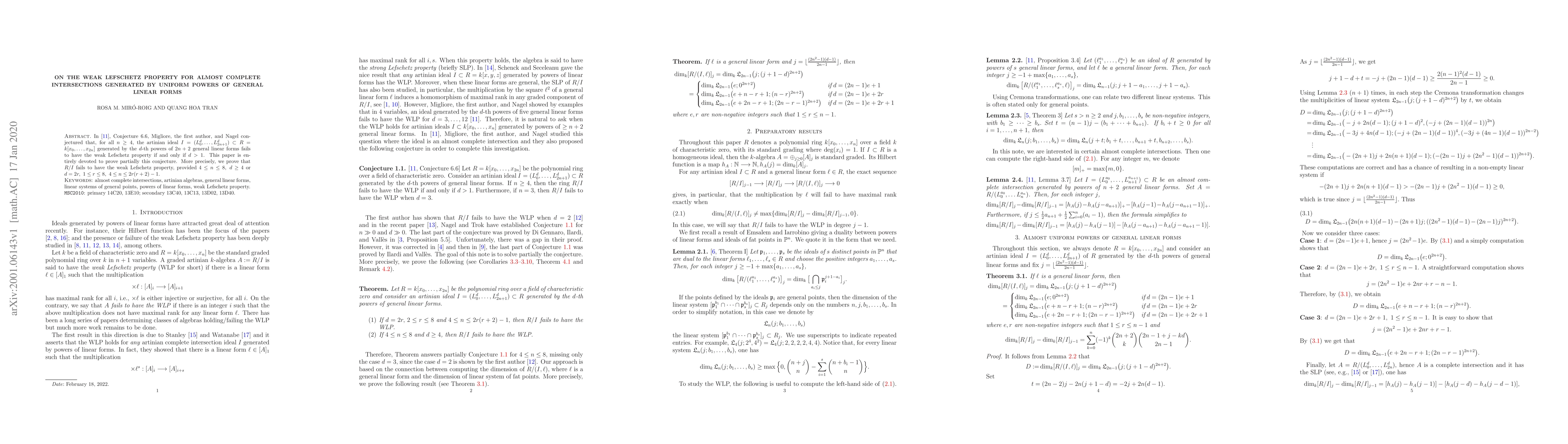 This paper proves a partial result for the conjecture that the artinian ideal generated by the d-th powers of general linear forms fails the weak Lefschetz property if $d>1$ for $n\geq 4$, specifically showing the failure for $4\leq n\leq 8$ and certain values of $d$.