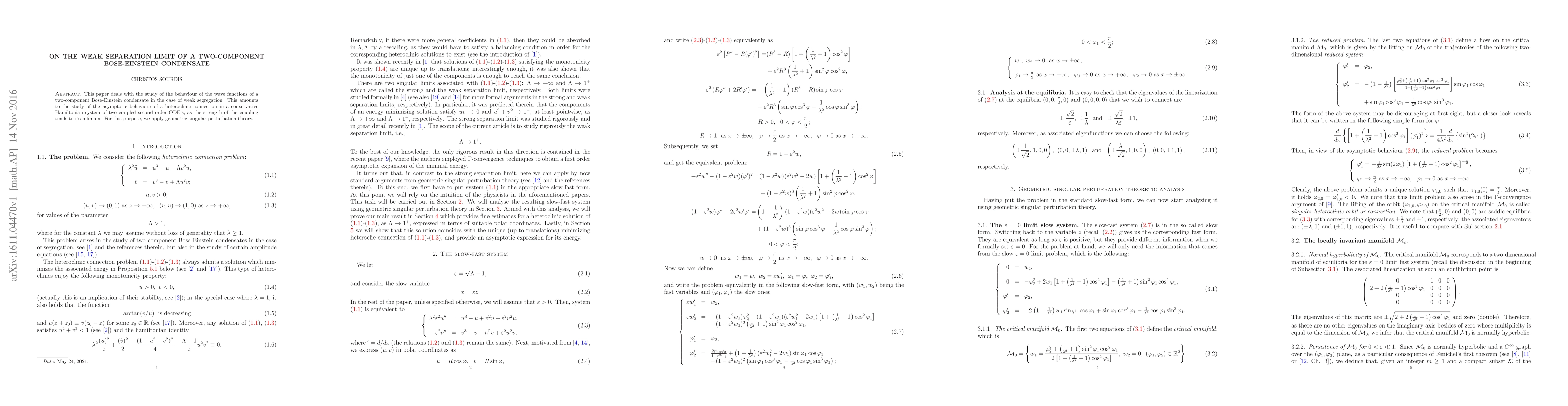 Researchers study the behavior of a two-component Bose-Einstein condensate under weak segregation, applying geometric singular perturbation theory to understand its asymptotic behavior as coupling strength decreases.