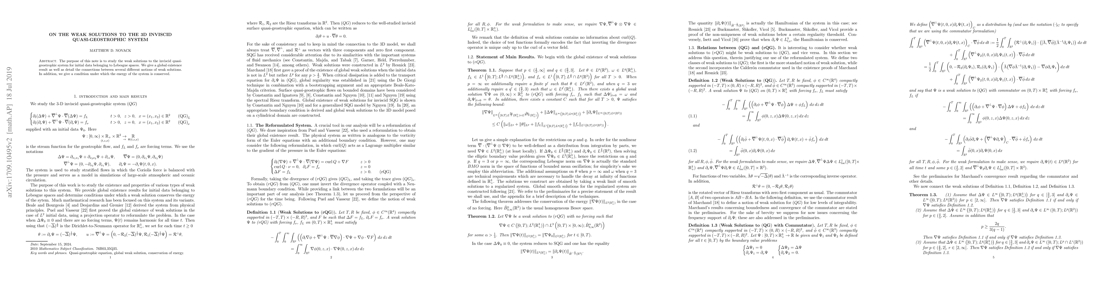 This paper investigates global existence of weak solutions to the 3D inviscid quasi-geostrophic system for initial data in Lebesgue spaces, finding connections between different notions of weak solutions and a condition for energy conservation.