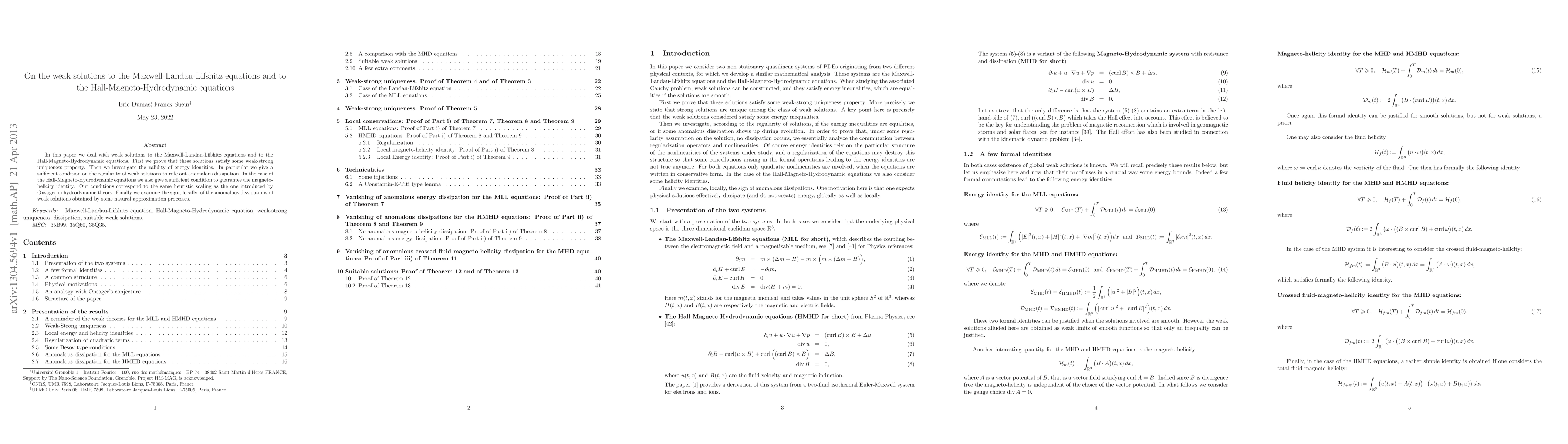 In this paper we deal with weak solutions to the Maxwell-Landau-Lifshitz equations and to the Hall-Magneto-Hydrodynamic equations. First we prove that these solutions satisfy some weak-strong uniqueness property. Then we investigate the validity of energy identities. In particular we give a sufficient condition on the regularity of weak solutions to rule out anomalous dissipation. In the case of the Hall-Magneto-Hydrodynamic equations we also give a sufficient condition to guarantee the magneto-helicity identity. Our conditions correspond to the same heuristic scaling as the one introduced by Onsager in hydrodynamic theory. Finally we examine the sign, locally, of the anomalous dissipations of weak solutions obtained by some natural approximation processes.