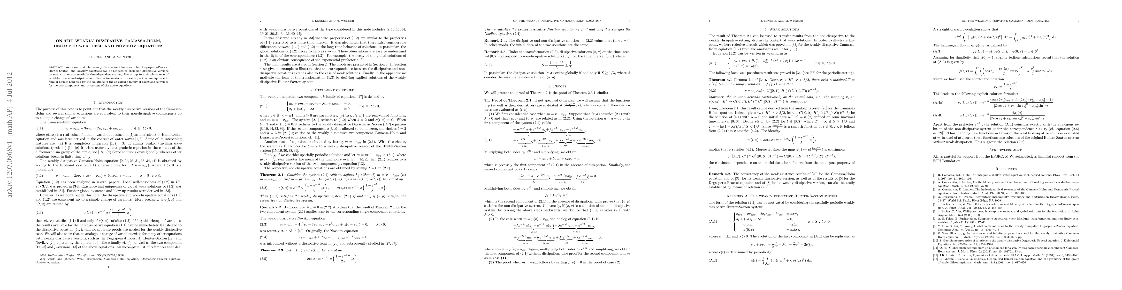 This paper demonstrates that weakly dissipative versions of the Camassa-Holm, Degasperis-Procesi, Hunter-Saxton, and Novikov equations can be transformed into their non-dissipative counterparts via an exponentially time-dependent scaling, showing their equivalence up to a change of variables. The findings also extend to the b-family and two-component variants of these equations.