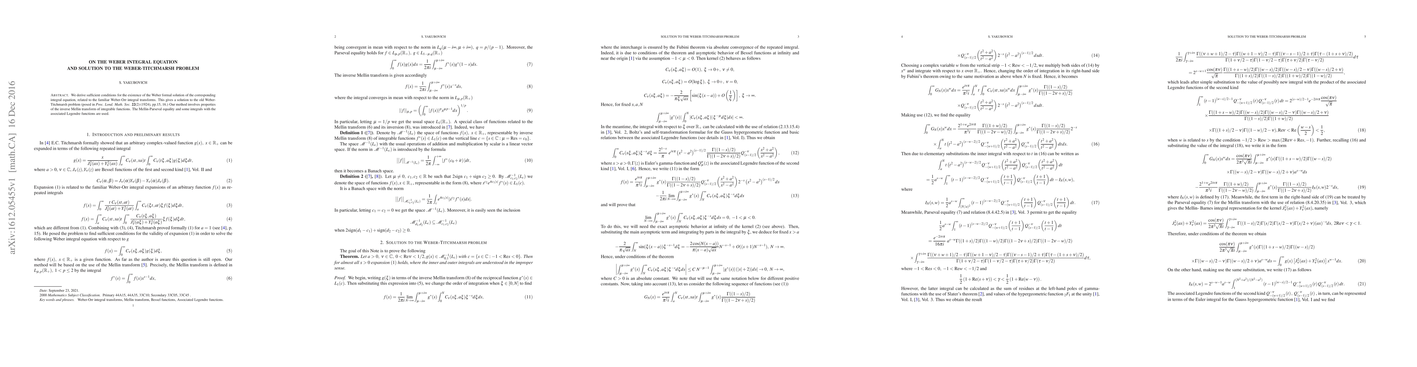 We derive sufficient conditions for the existence of the Weber formal solution of the corresponding integral equation, related to the familiar Weber-Orr integral transforms. This gives a solution to the old Weber-Titchmarsh problem (posed in Proc. Lond. Math. Soc. 22(2) (1924), pp.15, 16.) Our method involves properties of the inverse Mellin transform of integrable functions. The Mellin-Parseval equality and some integrals with the associated Legendre functions are used.