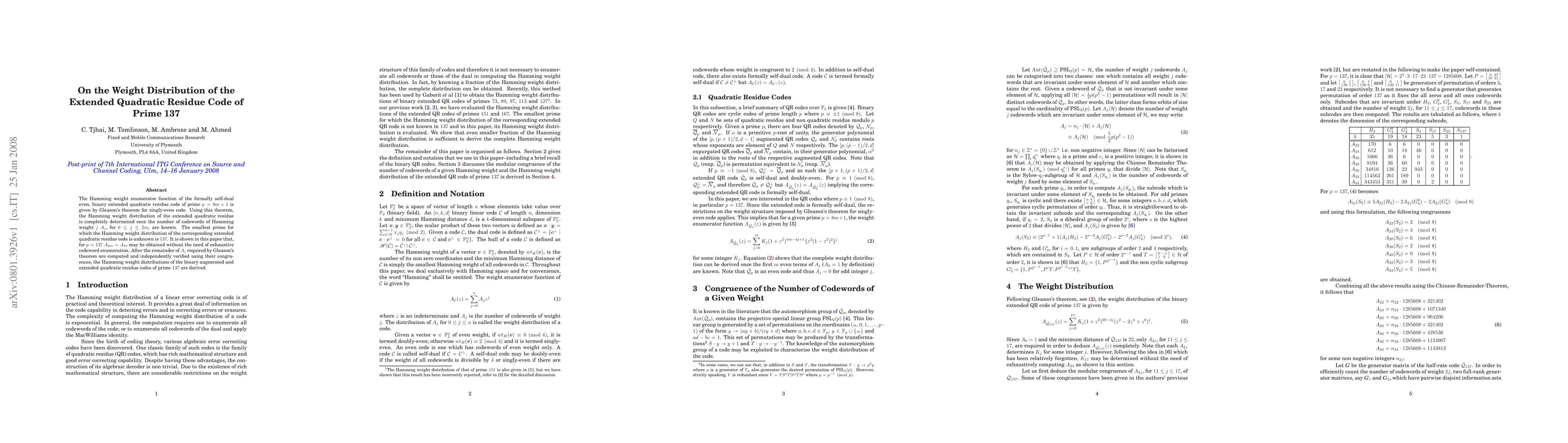 The Hamming weight enumerator function of the formally self-dual even, binary extended quadratic residue code of prime p = 8m + 1 is given by Gleason's theorem for singly-even code. Using this theorem, the Hamming weight distribution of the extended quadratic residue is completely determined once the number of codewords of Hamming weight j A_j, for 0 <= j <= 2m, are known. The smallest prime for which the Hamming weight distribution of the corresponding extended quadratic residue code is unknown is 137. It is shown in this paper that, for p=137 A_2m = A_34 may be obtained with out the need of exhaustive codeword enumeration. After the remainder of A_j required by Gleason's theorem are computed and independently verified using their congruences, the Hamming weight distributions of the binary augmented and extended quadratic residue codes of prime 137 are derived.
