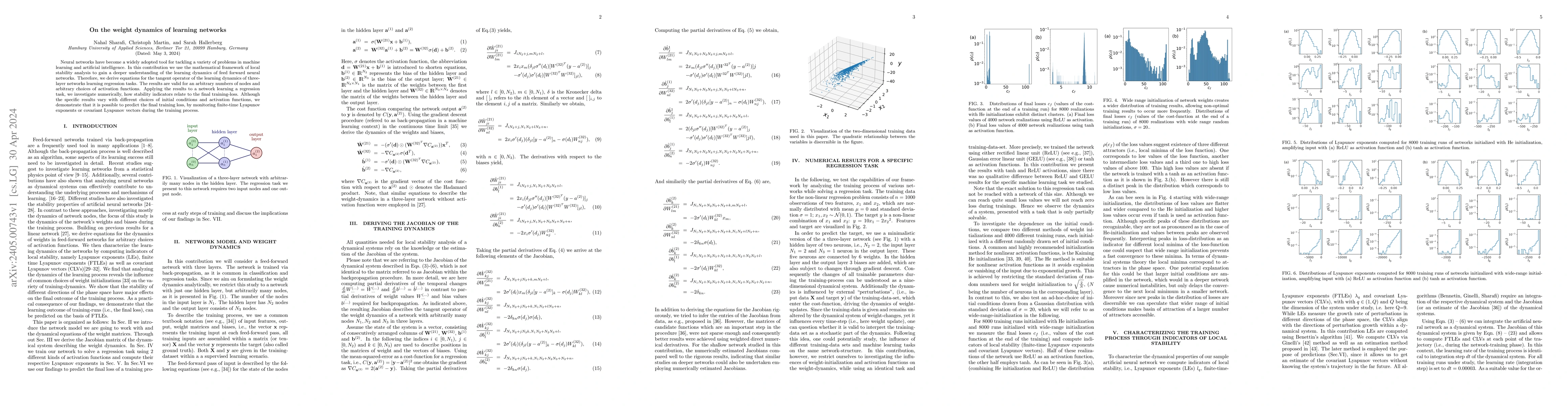 Neural networks have become a widely adopted tool for tackling a variety of problems in machine learning and artificial intelligence. In this contribution we use the mathematical framework of local stability analysis to gain a deeper understanding of the learning dynamics of feed forward neural networks. Therefore, we derive equations for the tangent operator of the learning dynamics of three-layer networks learning regression tasks. The results are valid for an arbitrary numbers of nodes and arbitrary choices of activation functions. Applying the results to a network learning a regression task, we investigate numerically, how stability indicators relate to the final training-loss. Although the specific results vary with different choices of initial conditions and activation functions, we demonstrate that it is possible to predict the final training loss, by monitoring finite-time Lyapunov exponents or covariant Lyapunov vectors during the training process.