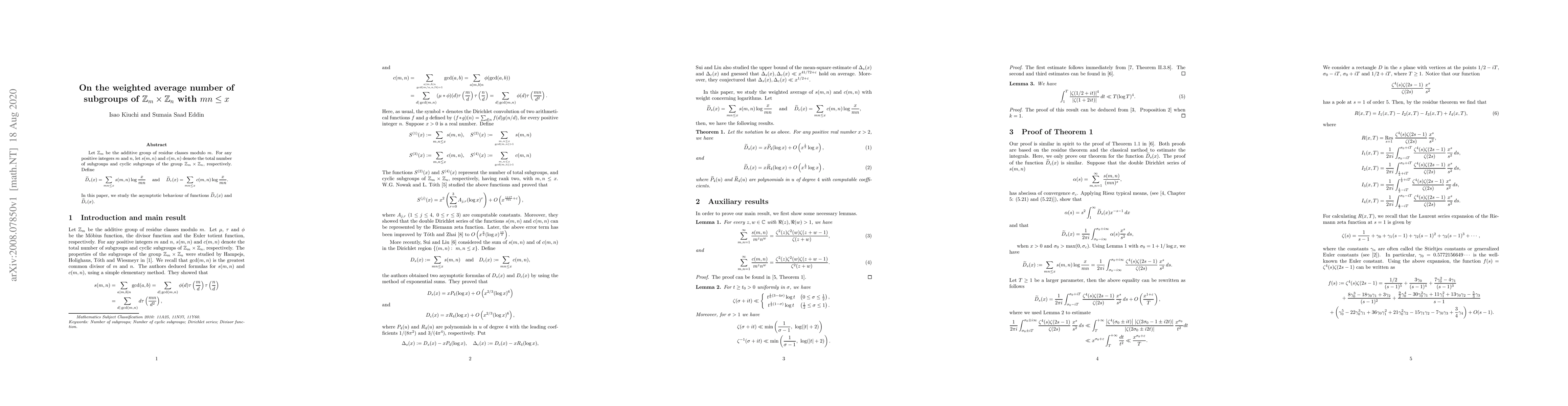 Let $\mathbb{Z}_{m}$ be the additive group of residue classes modulo $m$. For any positive integers $m$ and $n$, let $s(m,n)$ and $c(m,n)$ denote the total number of subgroups and cyclic subgroups of the group ${\mathbb{Z}}_{m}\times {\mathbb{Z}}_{n}$, respectively. Define $$ \widetilde{D}_{s}(x) = \sum_{mn\leq x}s(m,n)\log\frac{x}{mn} \quad \quad \widetilde{D}_{c}(x) = \sum_{mn\leq x}c(m,n)\log\frac{x}{mn}. $$ In this paper, we study the asymptotic behaviour of functions $\widetilde{D}_{s}(x)$ and $\widetilde{D}_{c}(x)$.