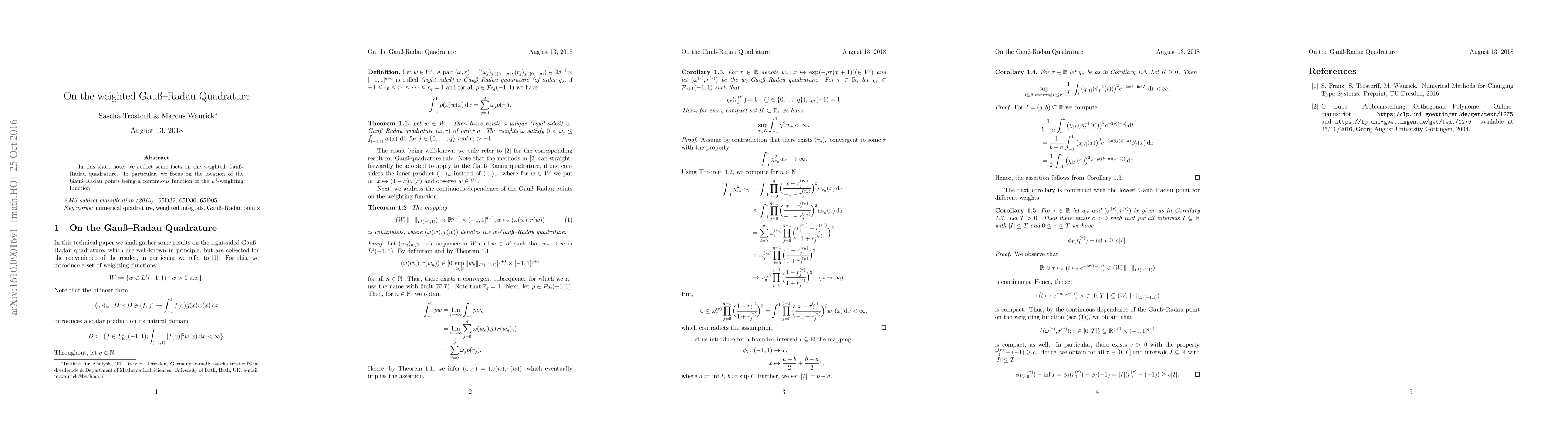 In this short note, we collect some facts on the weighted Gau{\ss}--Radau quadrature. In particular, we focus on the location of the Gau\ss--Radau points being a continuous function of the $L^1$-weighting function.