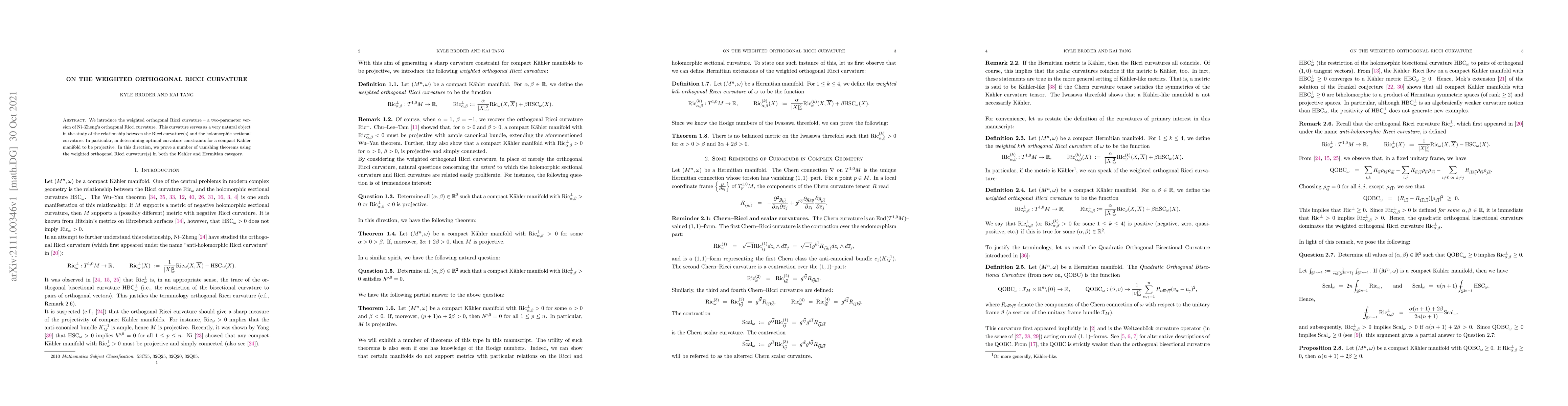 We introduce the weighted orthogonal Ricci curvature -- a two-parameter version of Ni--Zheng's orthogonal Ricci curvature. This curvature serves as a very natural object in the study of the relationship between the Ricci curvature(s) and the holomorphic sectional curvature. In particular, in determining optimal curvature constraints for a compact K\"ahler manifold to be projective. In this direction, we prove a number of vanishing theorems using the weighted orthogonal Ricci curvature(s) in both the K\"ahler and Hermitian category.