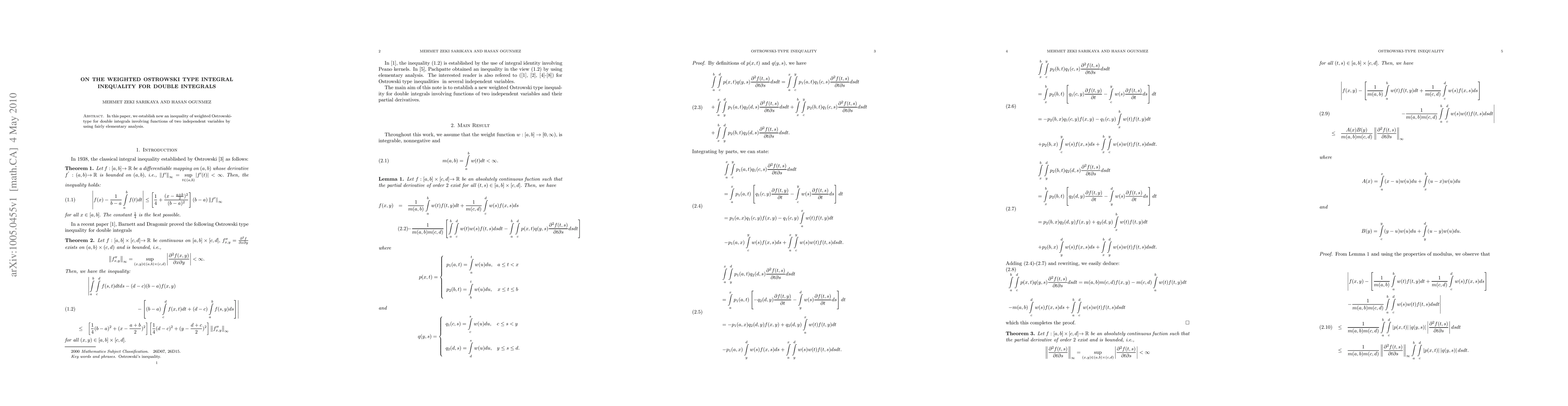 Summary: This paper introduces a new weighted Ostrowski-type inequality for double integrals of functions with two independent variables, derived through elementary analytical techniques. The result extends the classical Ostrowski inequality to a more complex integral setting.