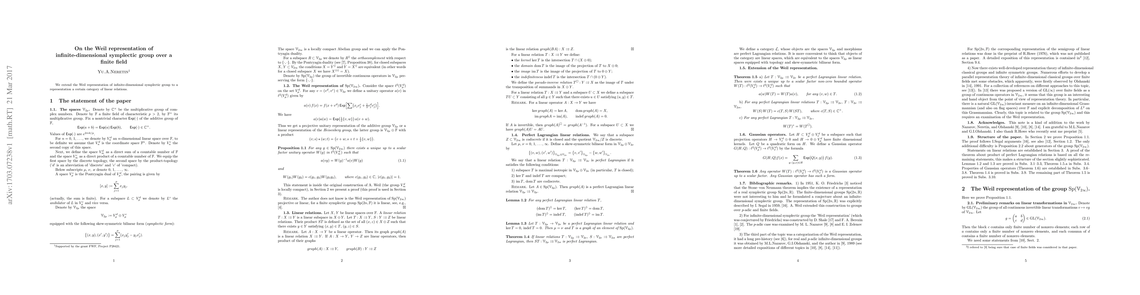 Summary: This paper extends the Weil representation of the infinite-dimensional symplectic group to encompass a specific category of linear relations, providing a deeper understanding of the group's structure over finite fields.