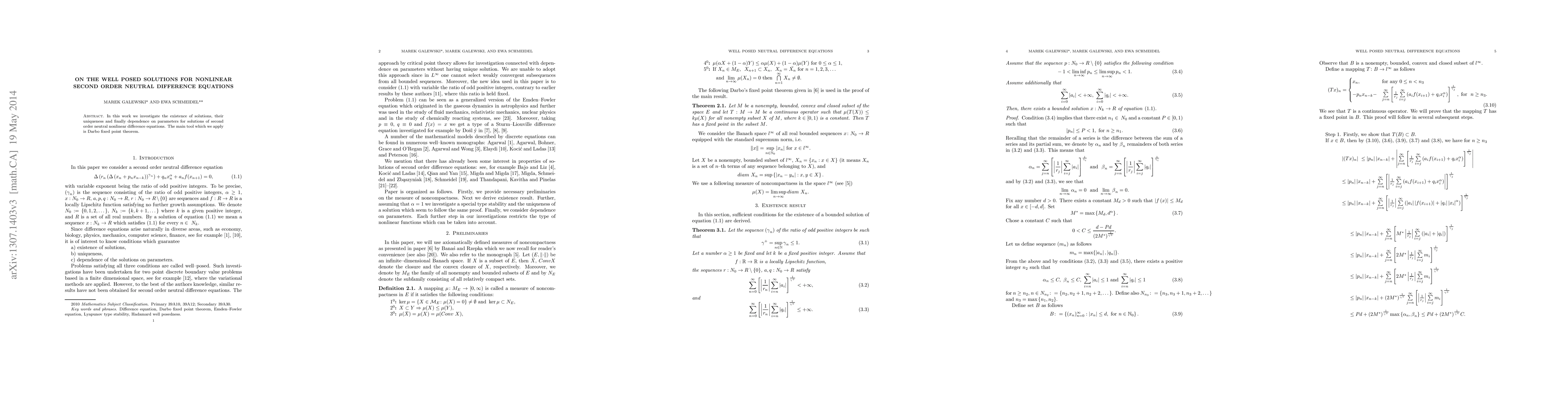 Summary: This paper explores the existence, uniqueness, and parameter dependence of solutions for second order neutral nonlinear difference equations using Darbo fixed point theorem as the primary analytical tool. The study focuses on well-posed solutions for these complex mathematical structures.