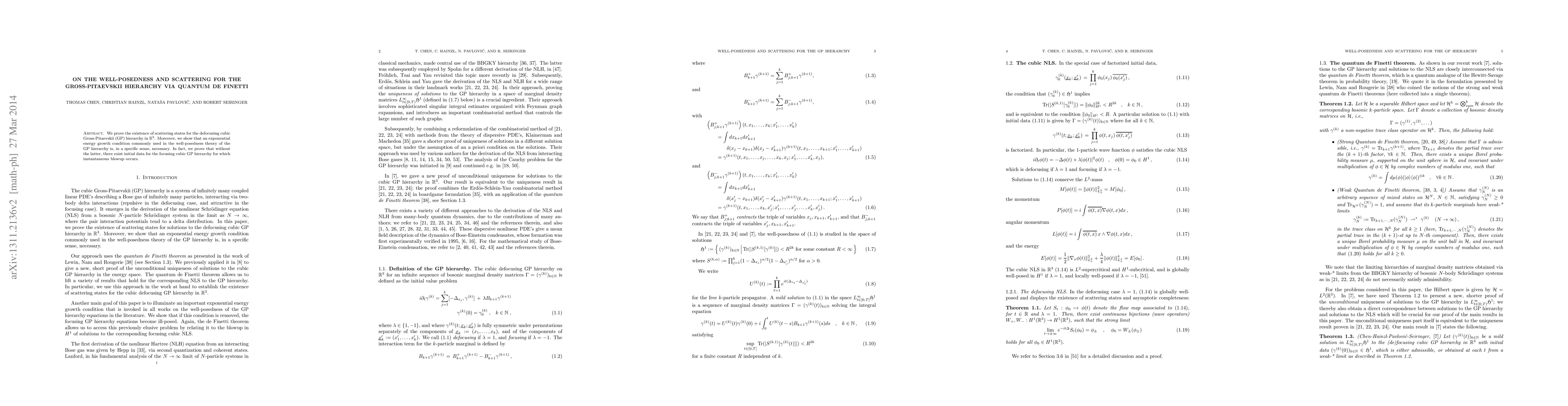 This paper proves the existence of scattering states for the defocusing cubic Gross-Pitaevskii hierarchy in ${\mathbb R}^3$ and demonstrates that an energy growth condition is necessary to prevent instantaneous blowup in the focusing cubic case.