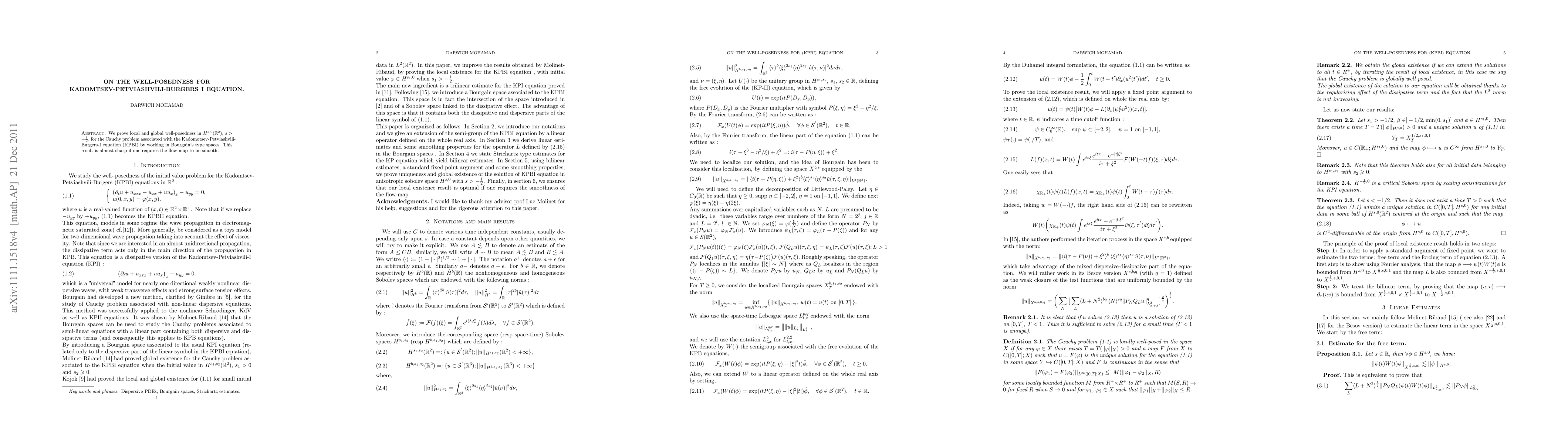 This paper establishes local and global well-posedness for the KPBI equation in the function space $H^{s,0}(\mathbb{R}^{2})$ for $s > -1/2$, using techniques from Bourgain's type spaces, and shows that the result is nearly optimal for smooth flow-maps.