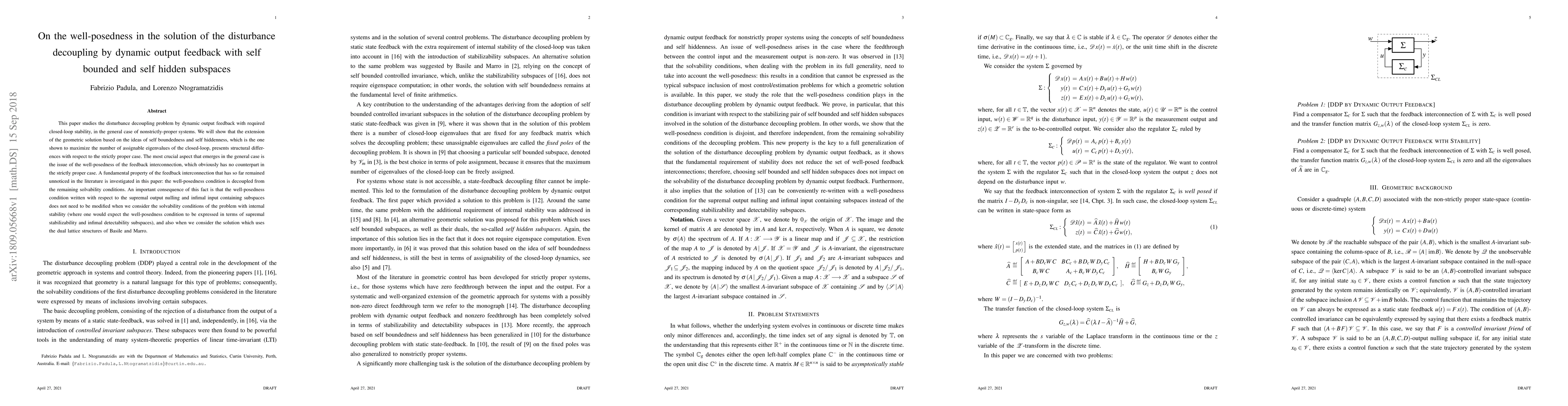 This paper studies the disturbance decoupling problem by dynamic output feedback with required closed-loop stability, in the general case of nonstrictly-proper systems. We will show that the extension of the geometric solution based on the ideas of self boundedness and self hiddenness, which is the one shown to maximize the number of assignable eigenvalues of the closed-loop, presents structural differ- ences with respect to the strictly proper case. The most crucial aspect that emerges in the general case is the issue of the well-posedness of the feedback interconnection, which obviously has no counterpart in the strictly proper case. A fundamental property of the feedback interconnection that has so far remained unnoticed in the literature is investigated in this paper: the well-posedness condition is decoupled from the remaining solvability conditions. An important consequence of this fact is that the well-posedness condition written with respect to the supremal output nulling and infimal input containing subspaces does not need to be modified when we consider the solvability conditions of the problem with internal stability (where one would expect the well-posedness condition to be expressed in terms of supremal stabilizability and infimal detectability subspaces), and also when we consider the solution which uses the dual lattice structures of Basile and Marro.