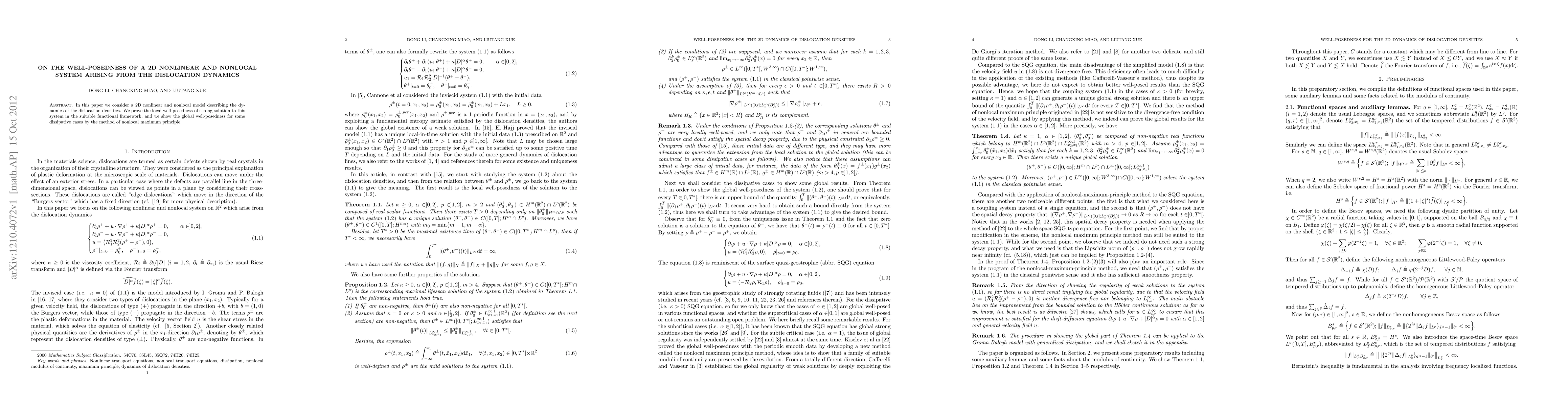 This paper investigates a 2D nonlinear and nonlocal system modeling dislocation densities, proving local well-posedness of strong solutions and global well-posedness for certain dissipative cases using the nonlocal maximum principle.