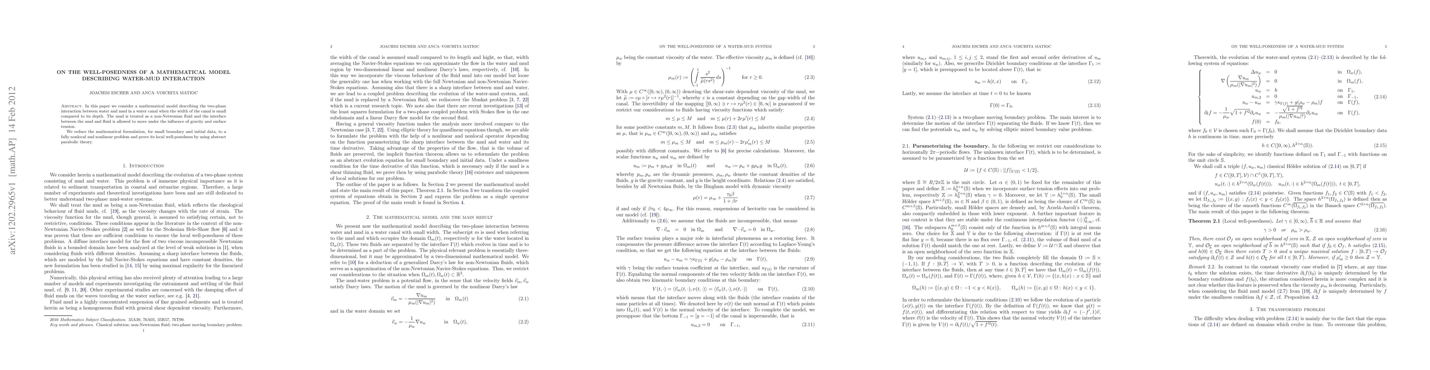 The paper introduces and analyzes a mathematical model for water-mud interaction, reducing it to a fully nonlinear and nonlocal problem, and proving its local well-posedness.