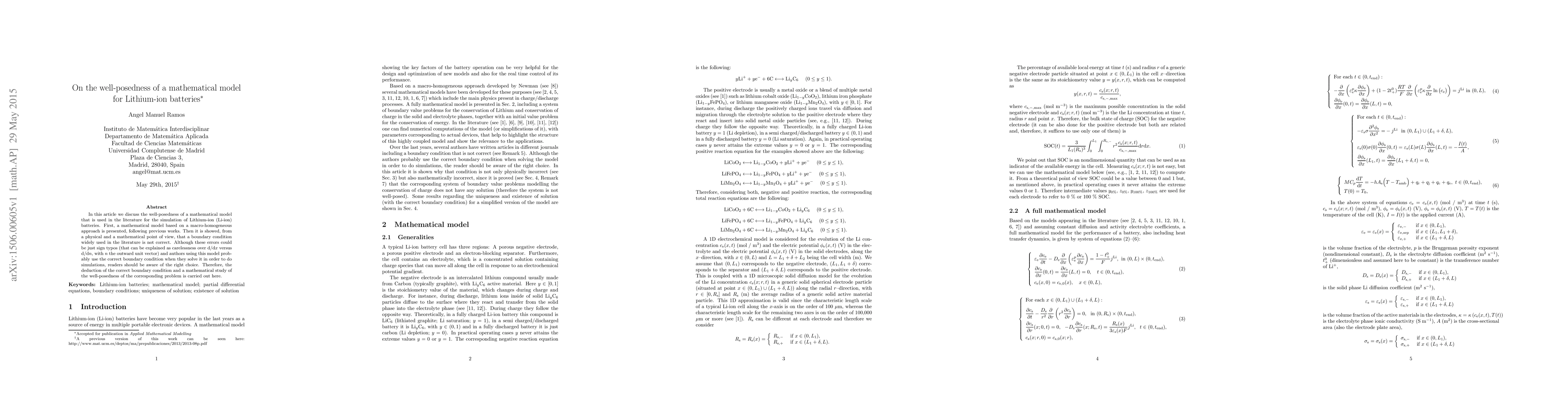 The research presents a mathematical model for Lithium-ion batteries based on a macro-homogeneous approach, analyzing its well-posedness and correcting an erroneous boundary condition used in the literature.