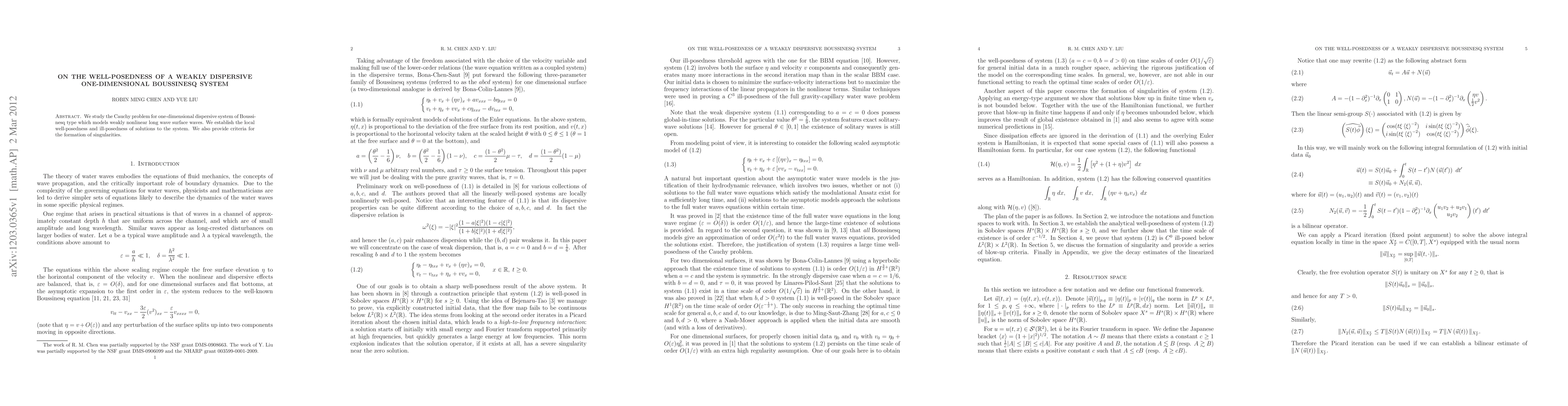 The paper investigates the Cauchy problem for a one-dimensional weakly dispersive Boussinesq system, establishing local well-posedness and ill-posedness of its solutions, along with criteria for singularity formation.