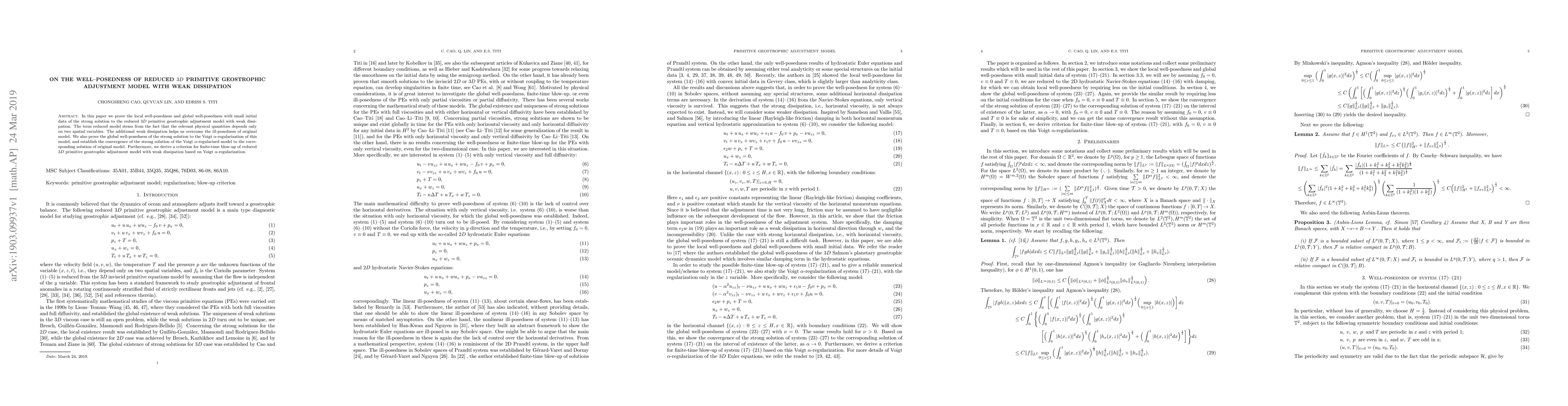 This paper proves local and global well-posedness for a reduced 3D primitive geostrophic adjustment model with weak dissipation, addressing the original model's ill-posedness. It also establishes the convergence of the Voigt $\alpha$-regularized model's solution to the original model's solution and provides a criterion for finite-time blow-up.