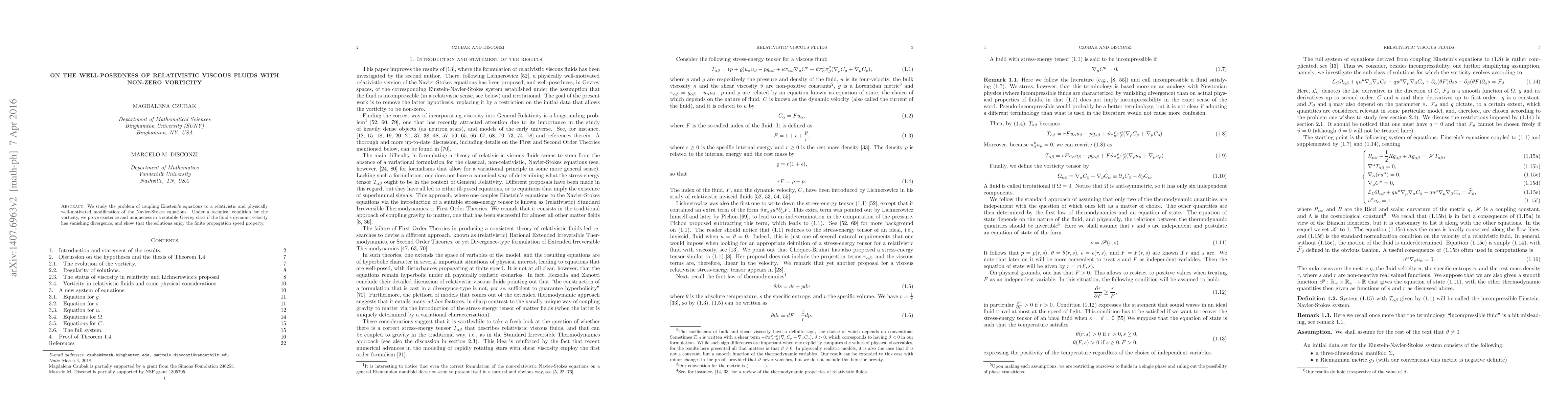 We study the problem of coupling Einstein's equations to a relativistic and physically well-motivated version of the Navier-Stokes equations. Under a natural evolution condition for the vorticity, we prove existence and uniqueness in a suitable Gevrey class if the fluid is incompressible, where this condition is given an appropriate relativistic interpretation, and show that the solutions enjoy the finite propagation speed property.