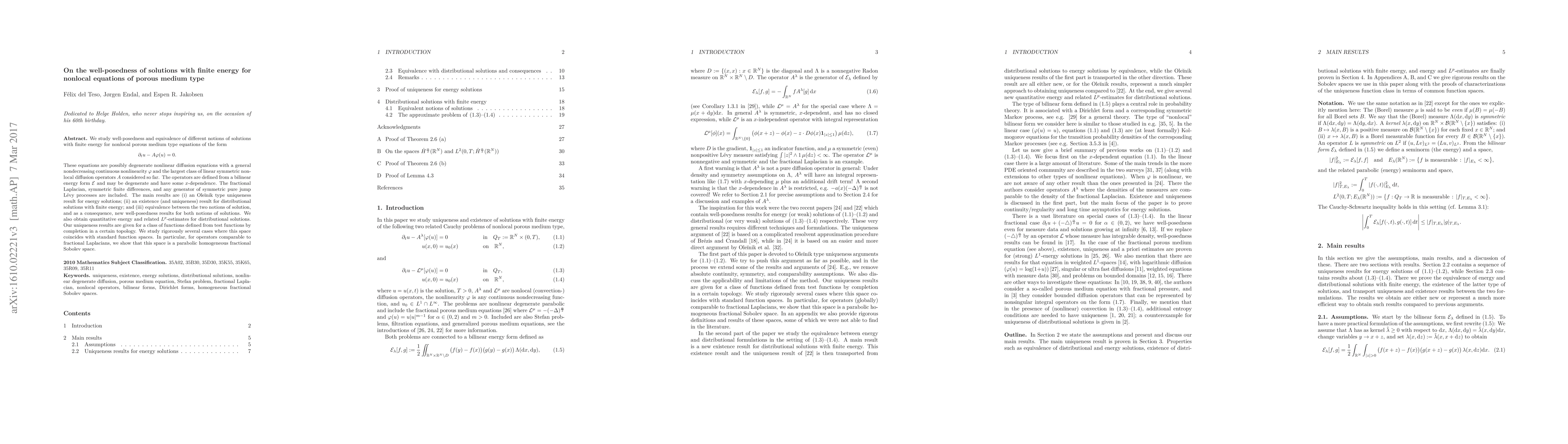 We study well-posedness and equivalence of different notions of solutions with finite energy for nonlocal porous medium type equations of the form $$\partial_tu-A\varphi(u)=0.$$ These equations are possibly degenerate nonlinear diffusion equations with a general nondecreasing continuous nonlinearity $\varphi$ and the largest class of linear symmetric nonlocal diffusion operators $A$ considered so far. The operators are defined from a bilinear energy form $\mathcal{E}$ and may be degenerate and have some $x$-dependence. The fractional Laplacian, symmetric finite differences, and any generator of symmetric pure jump L\'evy processes are included. The main results are (i) an Ole\u{\i}nik type uniqueness result for energy solutions; (ii) an existence (and uniqueness) result for distributional solutions with finite energy; and (iii) equivalence between the two notions of solution, and as a consequence, new well-posedness results for both notions of solutions. We also obtain quantitative energy and related $L^p$-estimates for distributional solutions. Our uniqueness results are given for a class of functions defined from test functions by completion in a certain topology. We study rigorously several cases where this space coincides with standard function spaces. In particular, for operators comparable to fractional Laplacians, we show that this space is a parabolic homogeneous fractional Sobolev space.