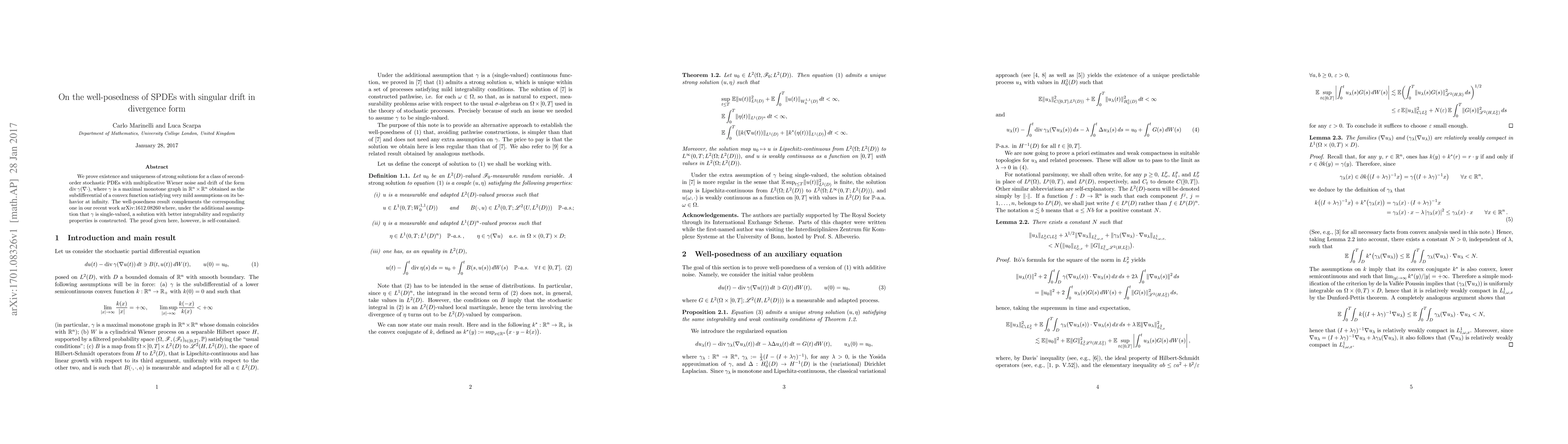 We prove existence and uniqueness of strong solutions for a class of second-order stochastic PDEs with multiplicative Wiener noise and drift of the form $\operatorname{div} \gamma(\nabla \cdot)$, where $\gamma$ is a maximal monotone graph in $\mathbb{R}^n \times \mathbb{R}^n$ obtained as the subdifferential of a convex function satisfying very mild assumptions on its behavior at infinity. The well-posedness result complements the corresponding one in our recent work arXiv:1612.08260 where, under the additional assumption that $\gamma$ is single-valued, a solution with better integrability and regularity properties is constructed. The proof given here, however, is self-contained.