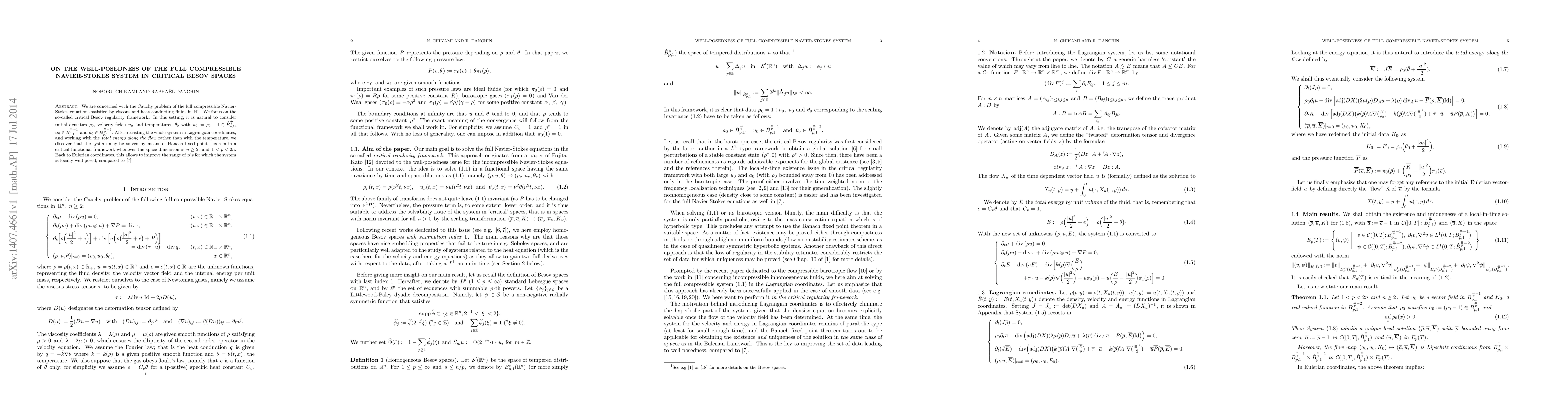 We are concerned with the Cauchy problem of the full compressible Navier-Stokes equations satisfied by viscous and heat conducting fluids in $\mathbb{R}^n.$ We focus on the so-called critical Besov regularity framework. In this setting, it is natural to consider initial densities $\rho_0,$ velocity fields $u_0$ and temperatures $\theta_0$ with $a_0:=\rho_0-1\in\dot B^{\frac np}_{p,1},$ $u_0\in\dot B^{\frac np-1}_{p,1}$ and $\theta_0\in\dot B^{\frac np-2}_{p,1}.$ After recasting the whole system in Lagrangian coordinates, and working with the \emph{total energy along the flow} rather than with the temperature, we discover that the system may be solved by means of Banach fixed point theorem in a critical functional framework whenever the space dimension is $n\geq2,$ and $1