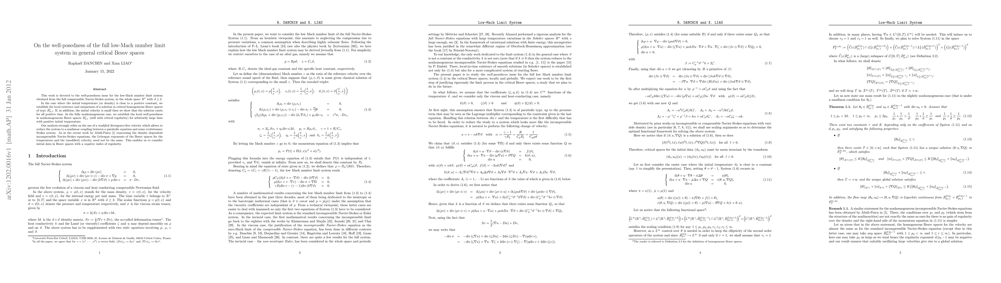 This paper establishes local and global well-posedness for the low-Mach number limit system derived from the full compressible Navier-Stokes equations, proving existence and uniqueness in critical Besov spaces under various initial conditions, with a focus on the use of modified divergence-free velocity to simplify the analysis.
