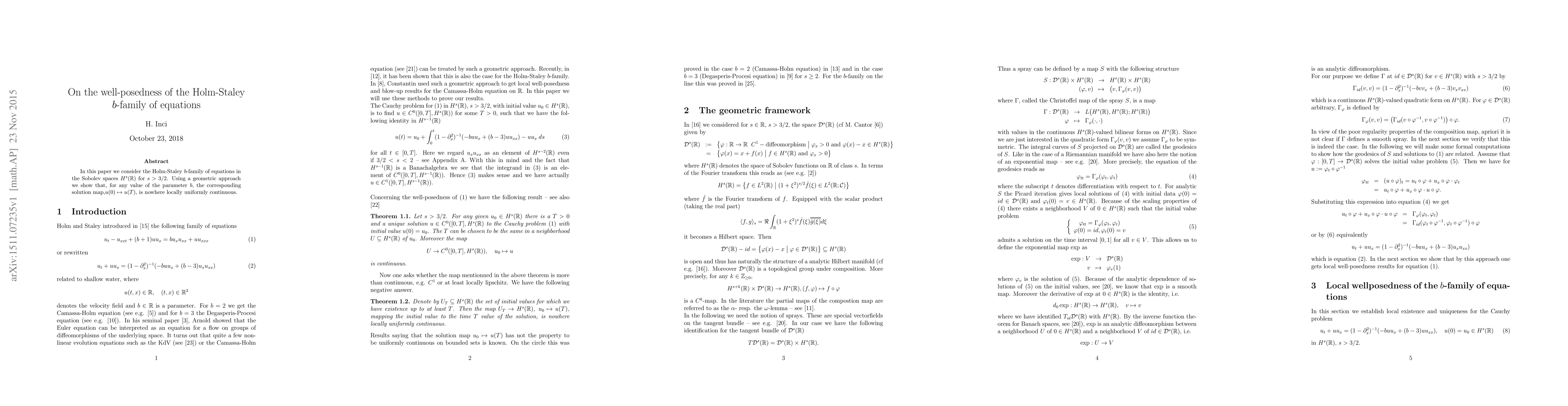 In this paper we consider the Holm-Staley $b$-family of equations in the Sobolev spaces $H^s(\mathbb R)$ for $s > 3/2$. Using a geometric approach we show that, for any value of the parameter $b$, the corresponding solution map,$u(0) \mapsto u(T)$, is nowhere locally uniformly continuous.
