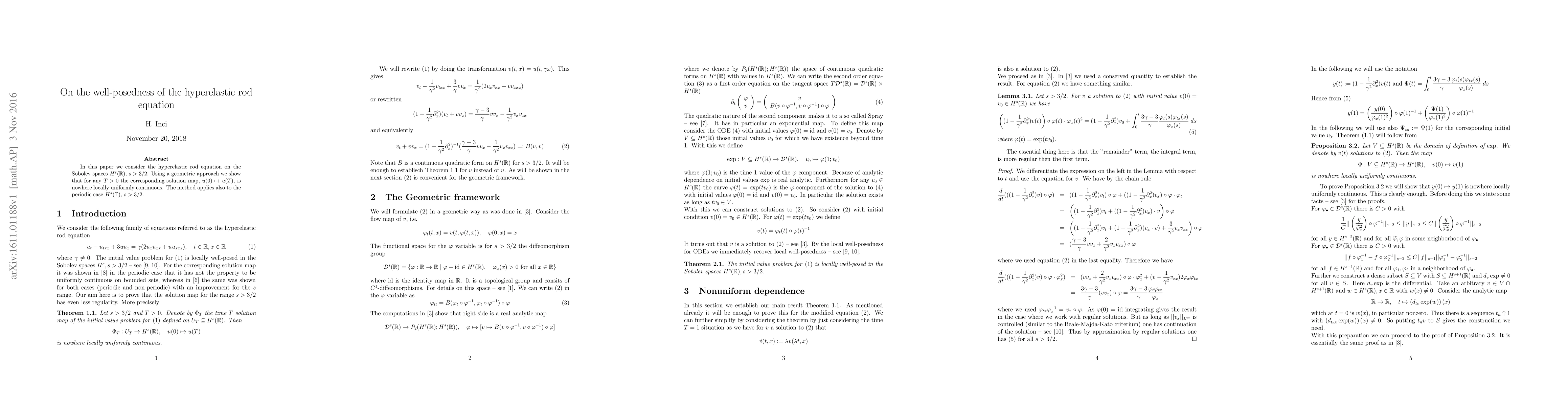 In this paper we consider the hyperelastic rod equation on the Sobolev spaces $H^s(\R)$, $s > 3/2$. Using a geometric approach we show that for any $T > 0$ the corresponding solution map, $u(0) \mapsto u(T)$, is nowhere locally uniformly continuous. The method applies also to the periodic case $H^s(\mathbb T)$, $s > 3/2$.