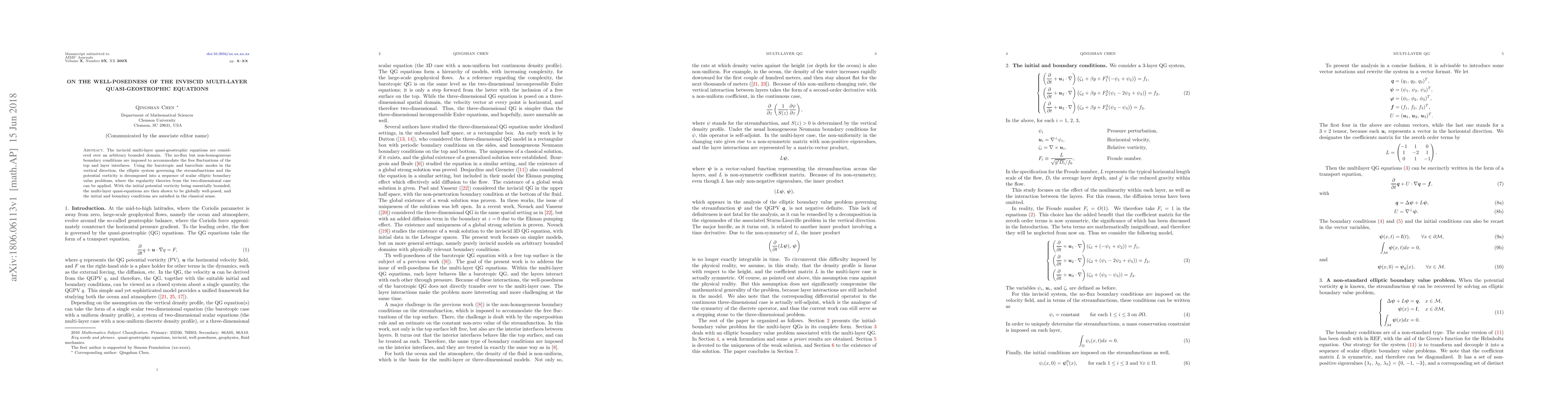 The inviscid multi-layer quasi-geostrophic equations are globally well-posed under specific boundary conditions, with initial potential vorticity being essentially bounded.