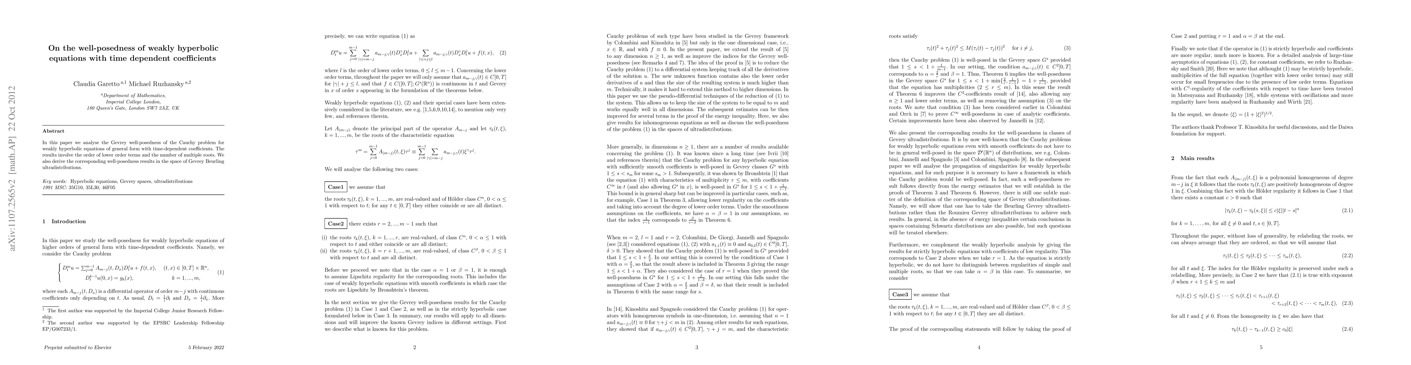 This paper investigates the Gevrey well-posedness of the Cauchy problem for weakly hyperbolic equations with time-dependent coefficients, focusing on the influence of lower-order terms and multiple roots. It also establishes well-posedness results in the space of Gevrey Beurling ultradistributions.
