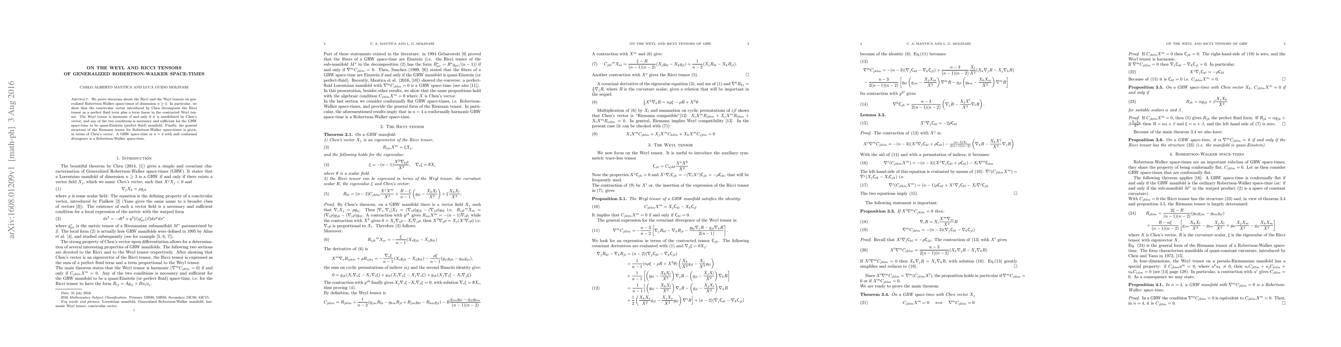 This paper proves theorems on the Ricci and Weyl tensors in generalized Robertson-Walker space-times, demonstrating that the Ricci tensor can be decomposed using Chen's concircular vector, and that the Weyl tensor's harmonicity is linked to its annihilation by this vector. It concludes that these tensor properties define quasi-Einstein manifolds.