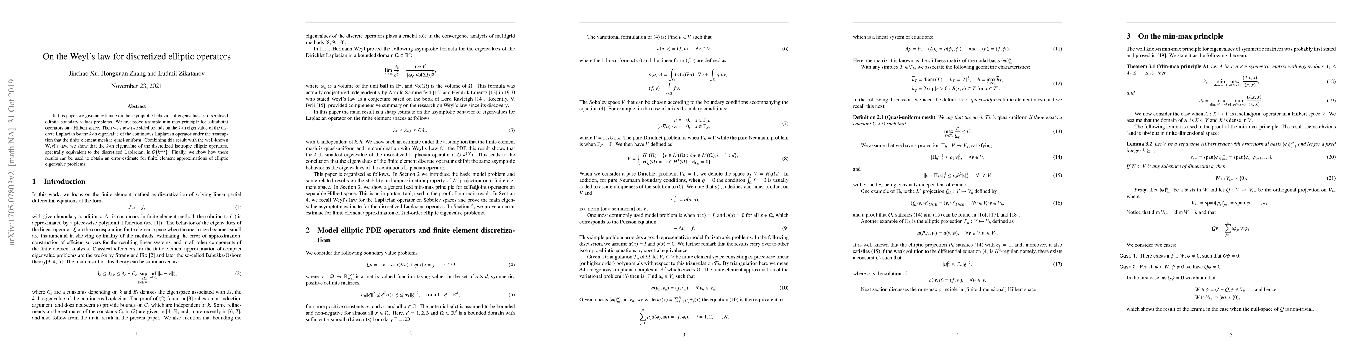 In this paper we give an estimate on the asymptotic behavior of eigenvalues of discretized elliptic boundary values problems. We first prove a simple min-max principle for selfadjoint operators on a Hilbert space. Then we show two sided bounds on the $k$-th eigenvalue of the discrete Laplacian by the $k$-th eigenvalue of the continuous Laplacian operator under the assumption that the finite element mesh is quasi-uniform. Combining this result with the well-known Weyl's law, we show that the $k$-th eigenvalue of the discretized isotropic elliptic operators, spectrally equivalent to the discretized Laplacian, is $\mathcal O\left(k^{2/d}\right)$. Finally, we show how these results can be used to obtain an error estimate for finite element approximations of elliptic eigenvalue problems.