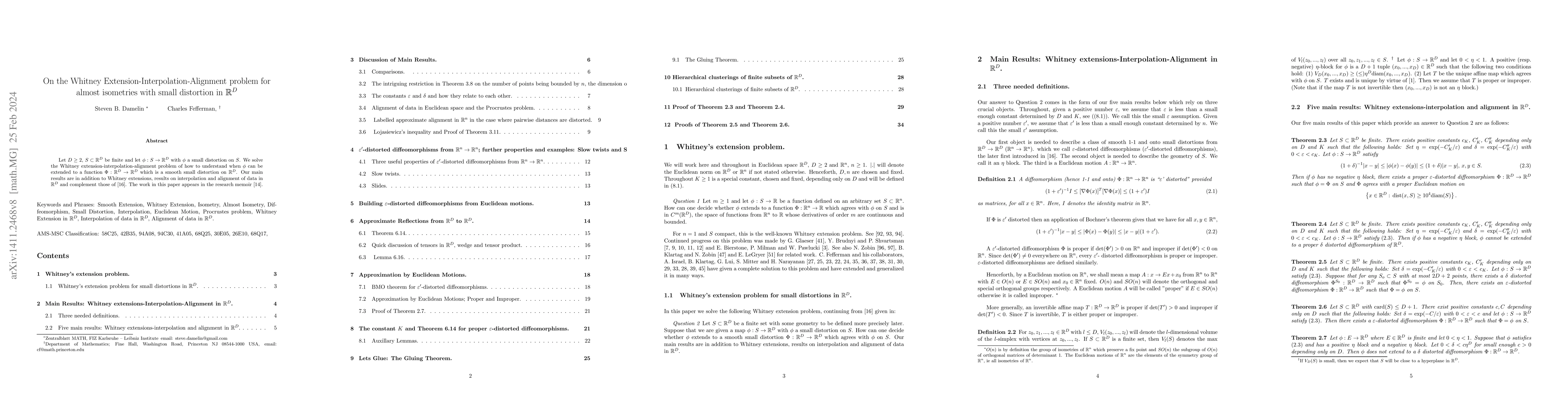In this paper, we study the following problem. Let $D\geq 2$, $S\subset \mathbb R^D$ be finite and let $\phi:S\to \mathbb R^D$ with $\phi$ a small distortion on $S$. We solve the Whitney extension-interpolation-alignment problem of how to understand when $\phi$ can be extended to a function $\Phi:\mathbb R^D\to \mathbb R^D$ which is a smooth small distortion on $\mathbb R^D$. The work in this paper appears in the research memoir [14]
