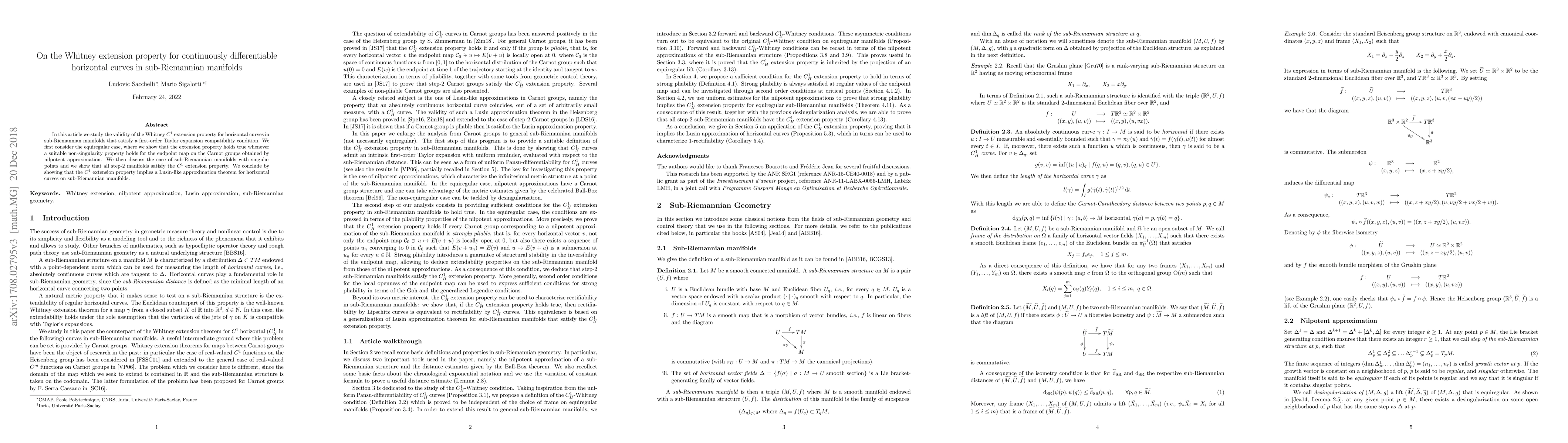 In this article we study the validity of the Whitney $C^1$ extension property for horizontal curves in sub-Riemannian manifolds endowed with 1-jets that satisfy a first-order Taylor expansion compatibility condition. We first consider the equiregular case, where we show that the extension property holds true whenever a suitable non-singularity property holds for the input-output maps on the Carnot groups obtained by nilpotent approximation. We then discuss the case of sub-Riemannian manifolds with singular points and we show that all step-2 manifolds satisfy the $C^1$ extension property. We conclude by showing that the $C^1$ extension property implies a Lusin-like approximation theorem for horizontal curves on sub-Riemannian manifolds.
