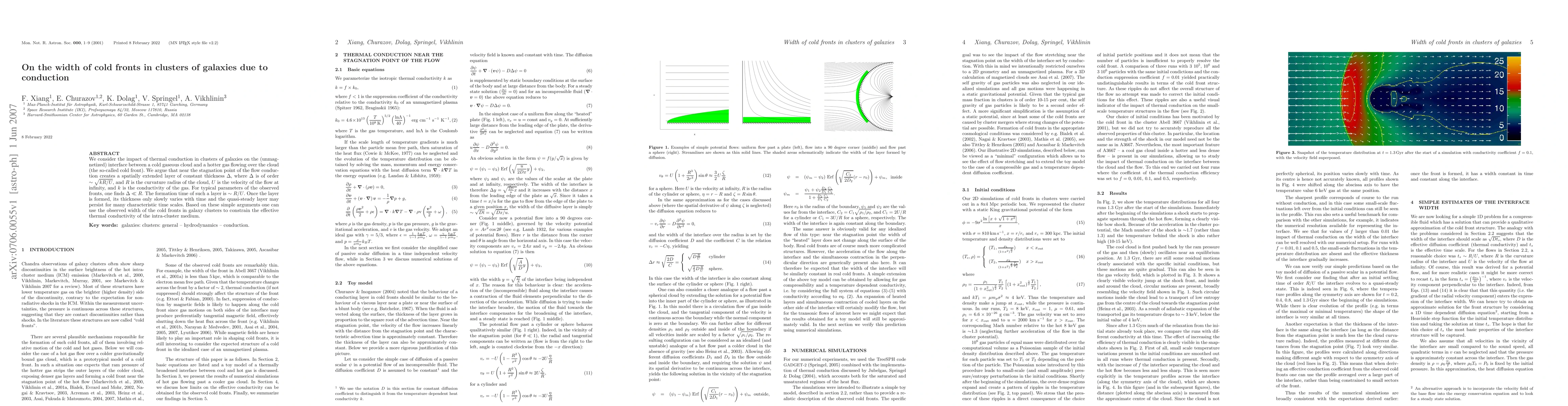 This paper investigates how thermal conduction in galaxy clusters affects the width of cold fronts, finding that conduction creates a constant-thickness layer near the stagnation point. The layer's thickness is proportional to $\sqrt{kR/U}$, where $k$ is conductivity, $R$ is the cloud's curvature radius, and $U$ is the flow velocity, and it can be used to constrain the intra-cluster medium's thermal conductivity.