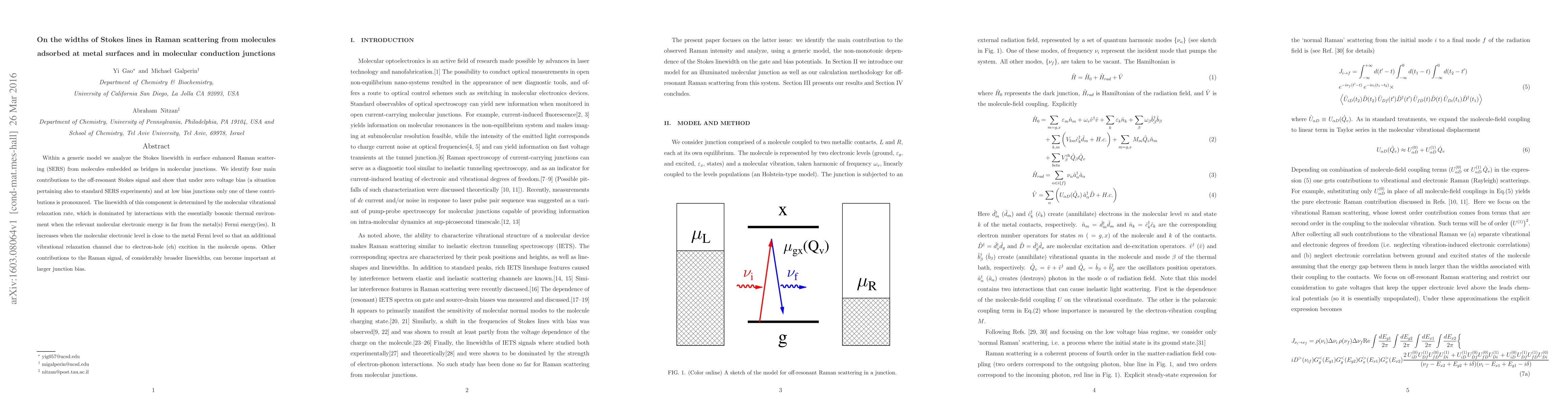 This paper analyzes the Stokes linewidth in surface-enhanced Raman scattering from molecules in molecular junctions, identifying four main contributions. Under zero voltage bias, the linewidth is primarily determined by molecular vibrational relaxation, increasing when the electronic level is near the metal Fermi level due to electron-hole excition.